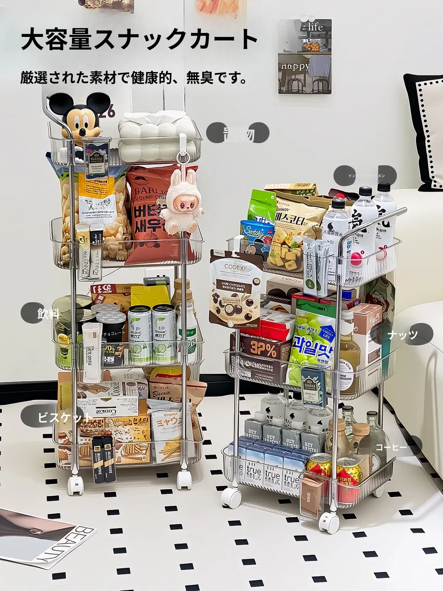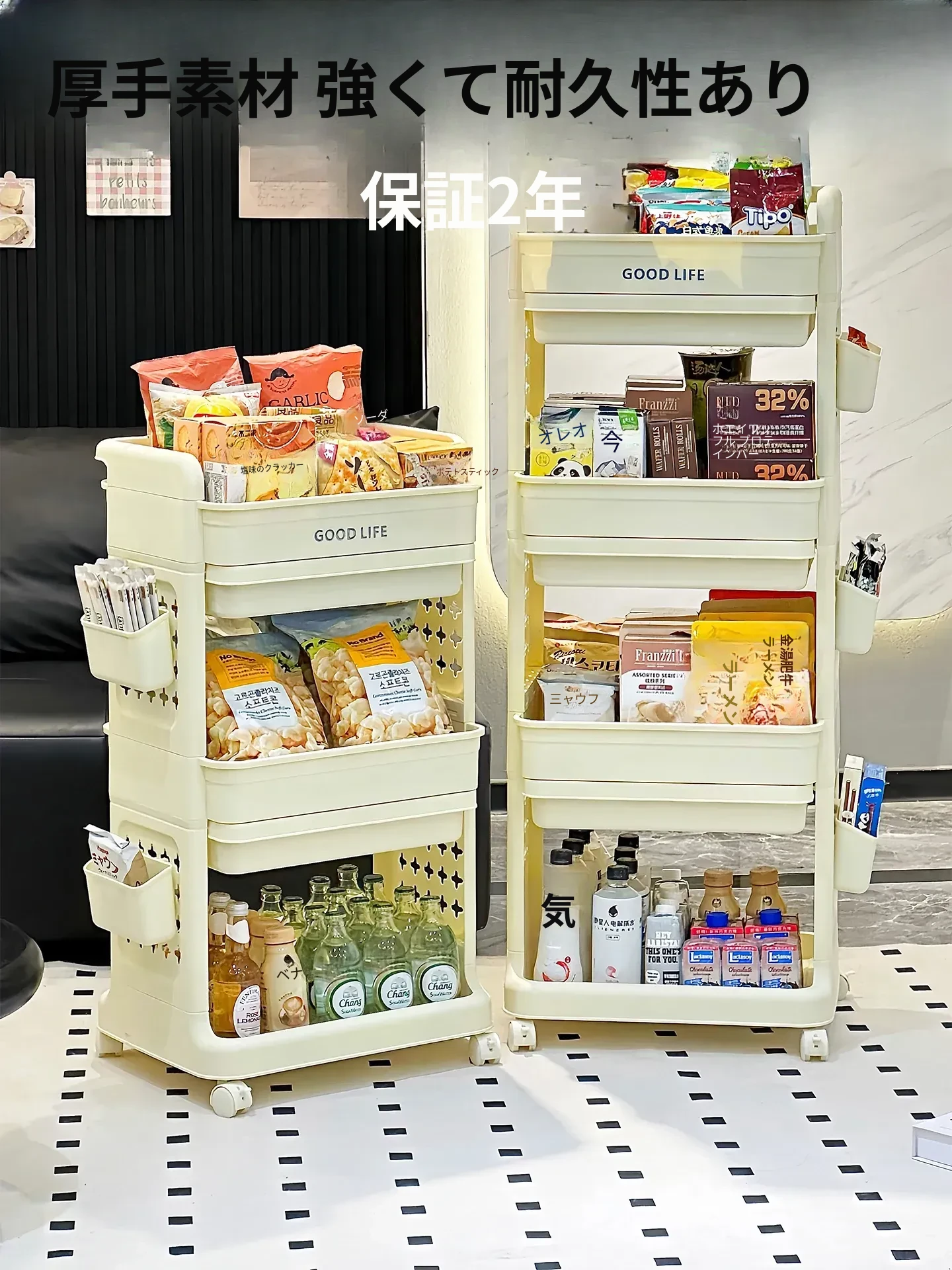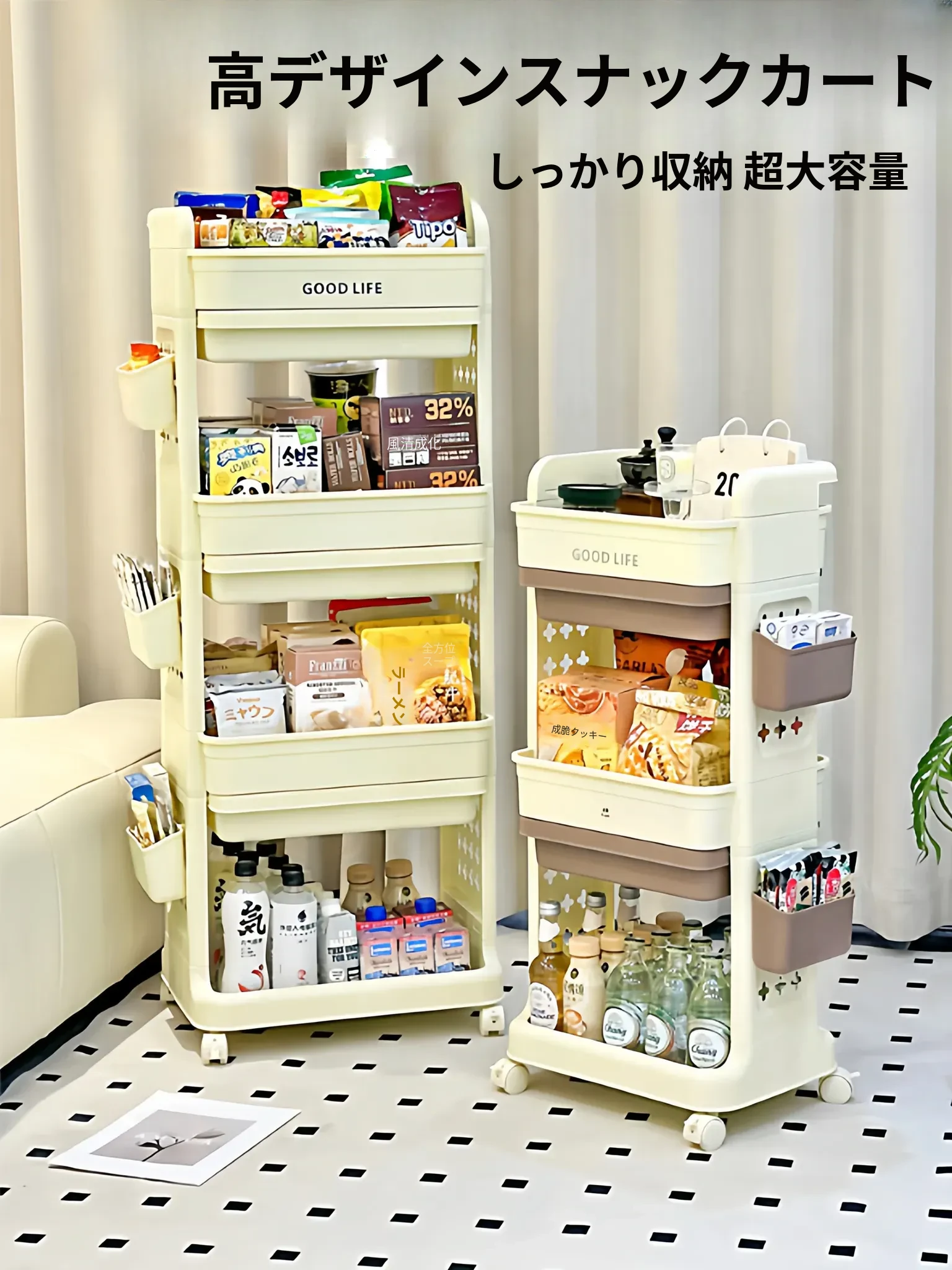おしゃれなスナック収納キャビネット!移動可能な多段式トロリーで、リビングやおもちゃの整理にも最適。美しいデザインで、あなたの空間をスタイリッシュに演出します!