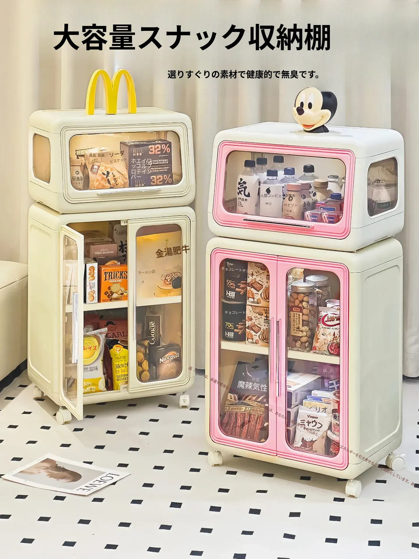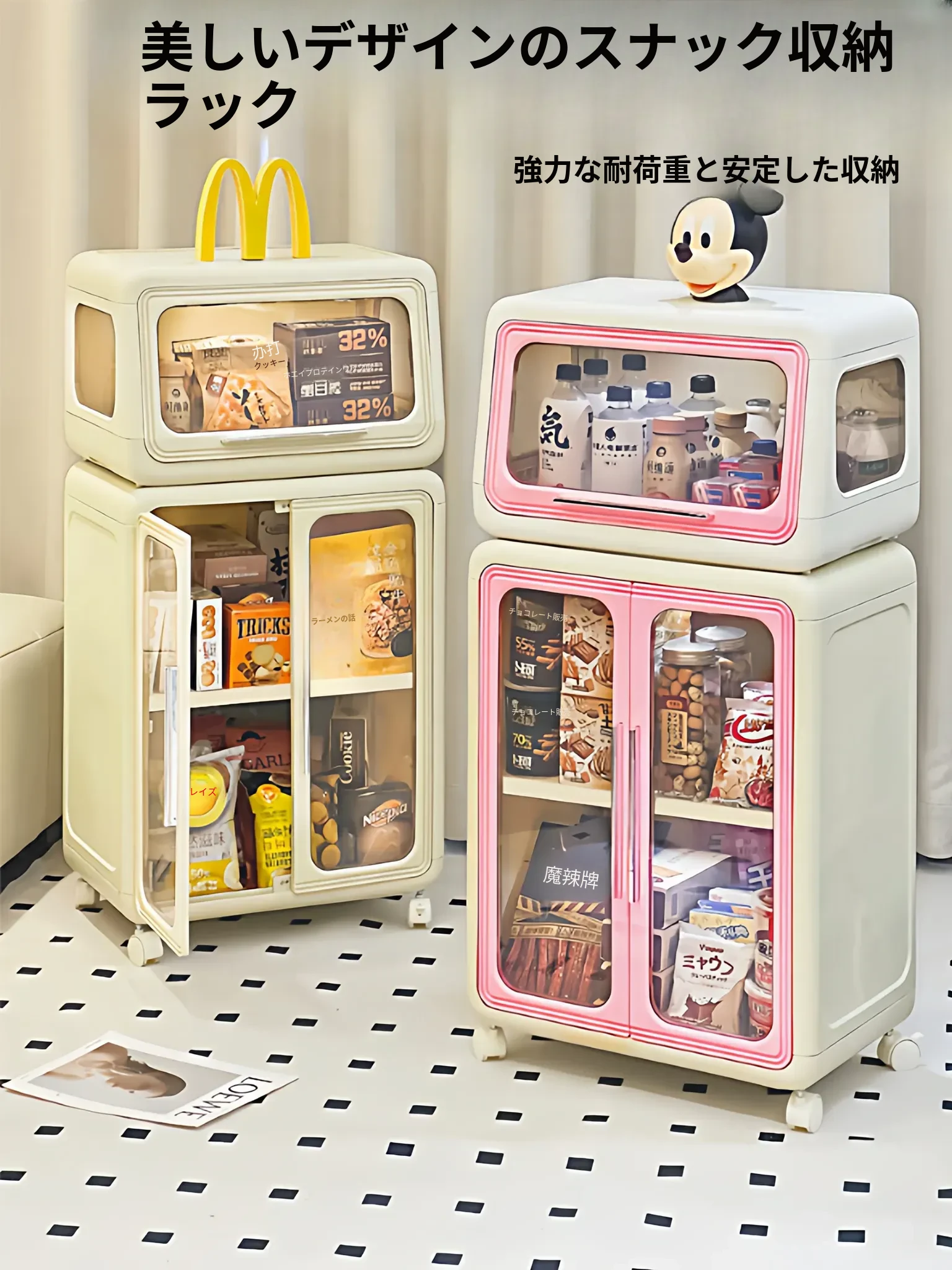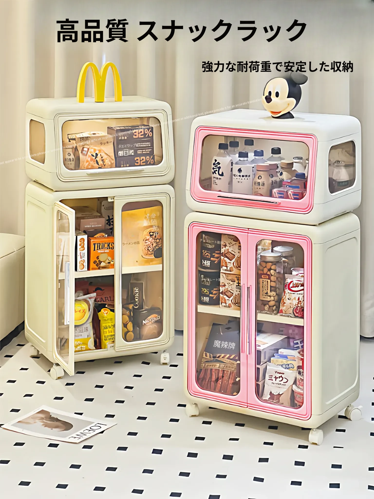 おしゃれなスナック収納キャビネット!移動可能な多段式トロリーで、リビングやおもちゃの整理にも最適。美しいデザインで、あなたの空間をスタイリッシュに演出します!