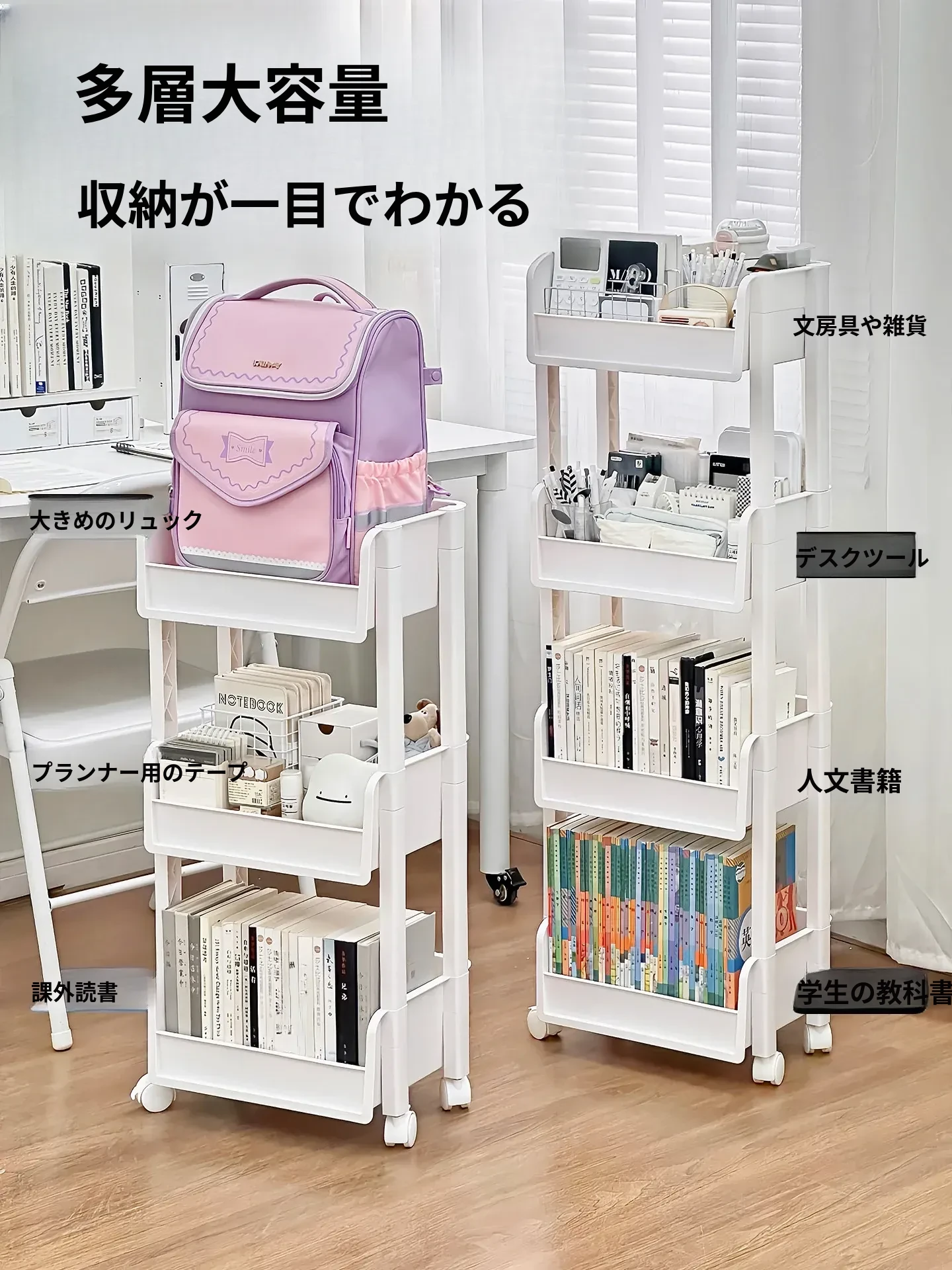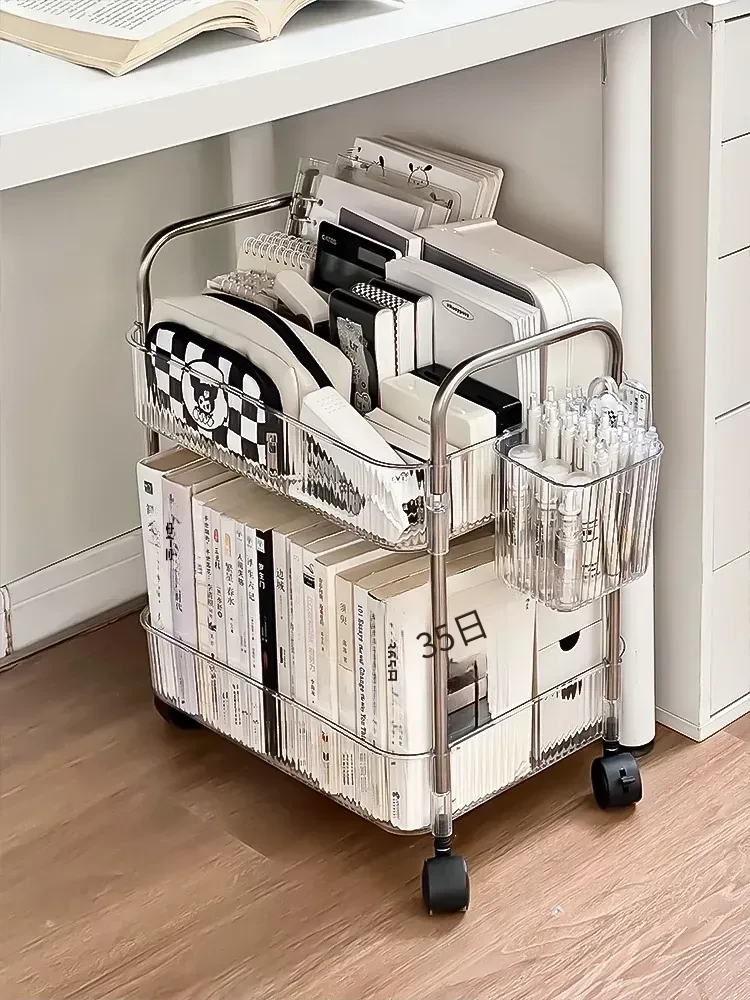 デスク下の小型キャリーラック - 学生のための便利な収納スペース!移動可能な書籍整理棚、隙間にもピッタリフィット。お家での整理整頓をサポートするアイテムです!