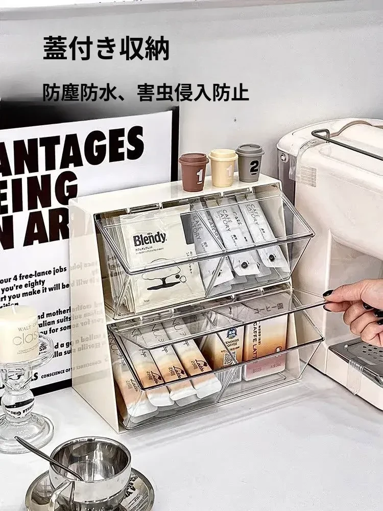 デスク上の茶葉やコーヒーカプセルをスマートに整理!フタ付き防塵収納ラック - おしゃれなティーバッグホルダーで、オフィスや自宅のスペースをスッキリ整頓。茶杯収納ボックスとしても最適!