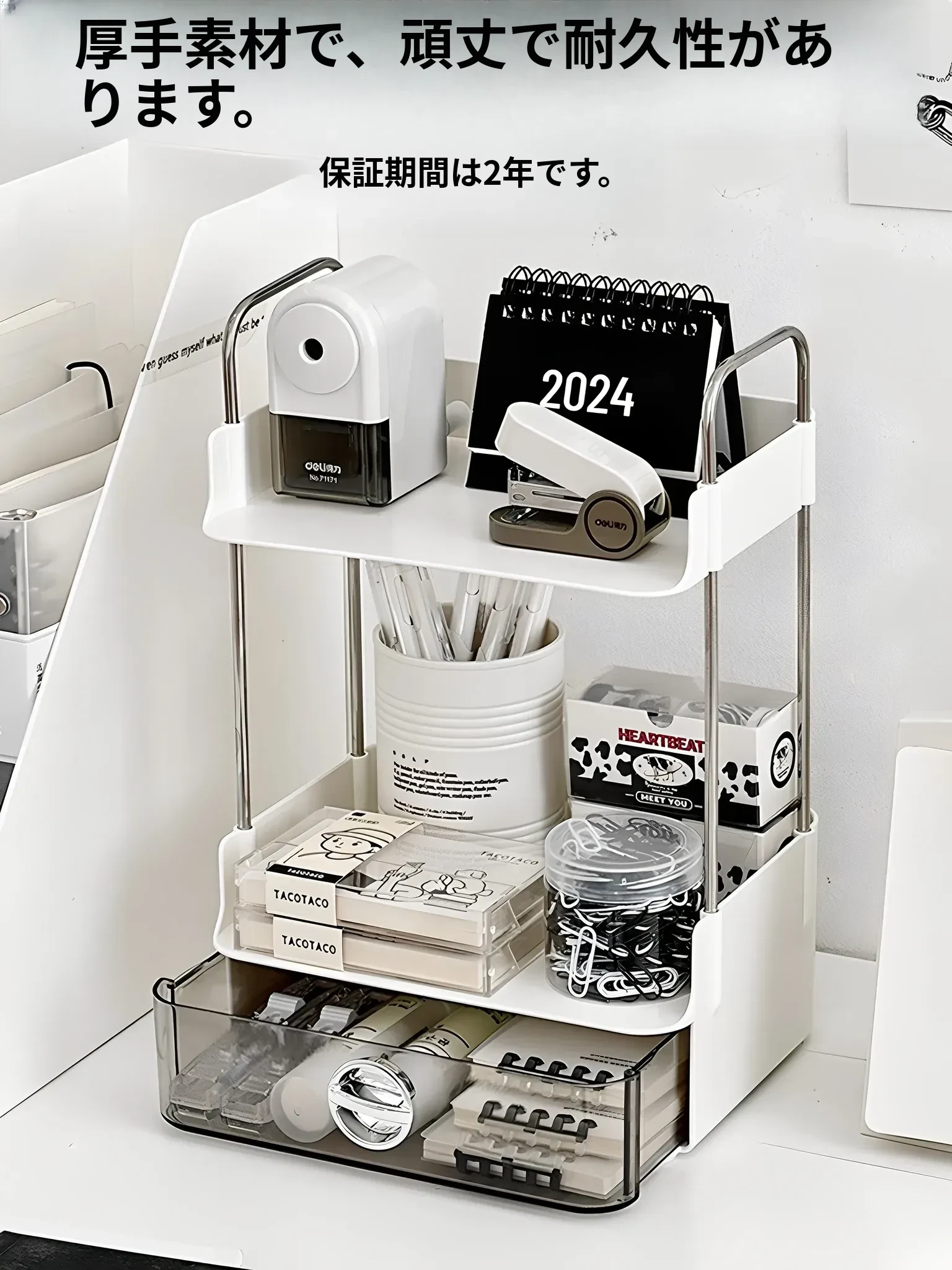 デスク収納ラック - 引き出し付き2段整理棚!文房具や小物をすっきり収納し、学習や仕事に最適なデスク環境を提供します。寮やオフィスでも使えるスタイリッシュなデザイン!