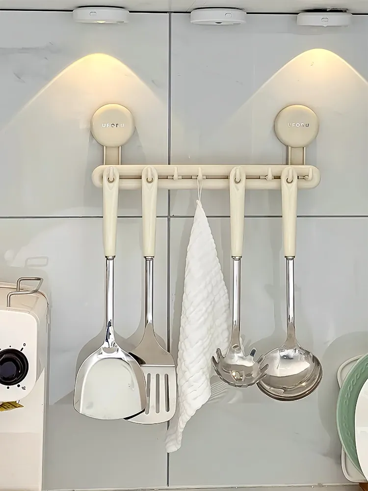 穴なしで簡単取り付け!キッチン用フック&バー、調理器具をすっきり収納できる壁掛け式ラック。フライ返しやスプーンも一体で整理、スペースを有効活用!