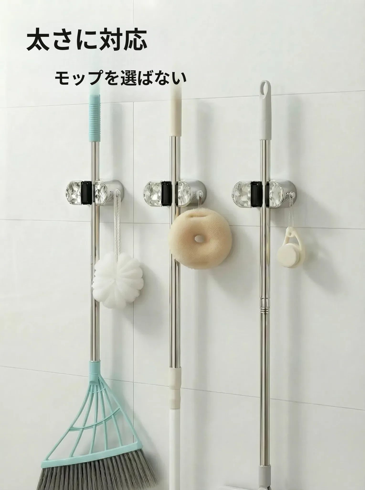 壁掛けモップクリップフック - 穴あけ不要で掃除道具をスマートに収納!トイレや洗面所の壁にぴったりの便利アイテムで、すっきりとした空間を実現します。