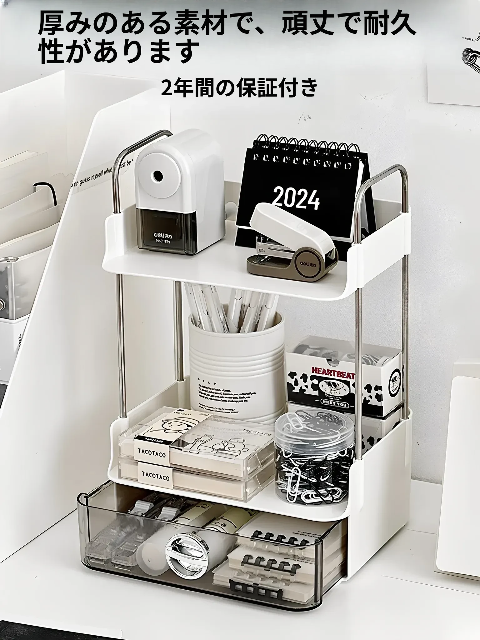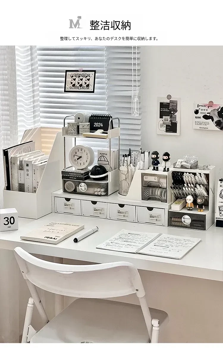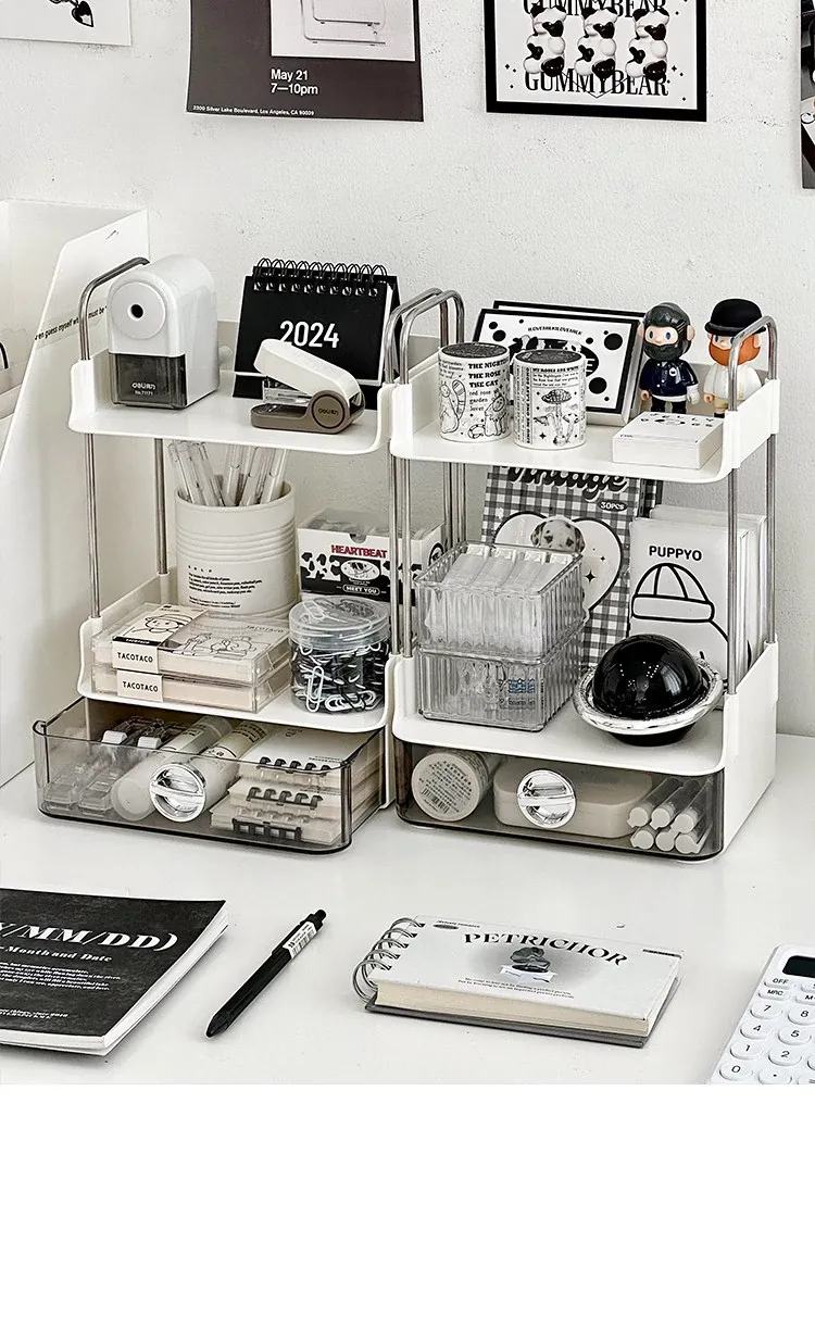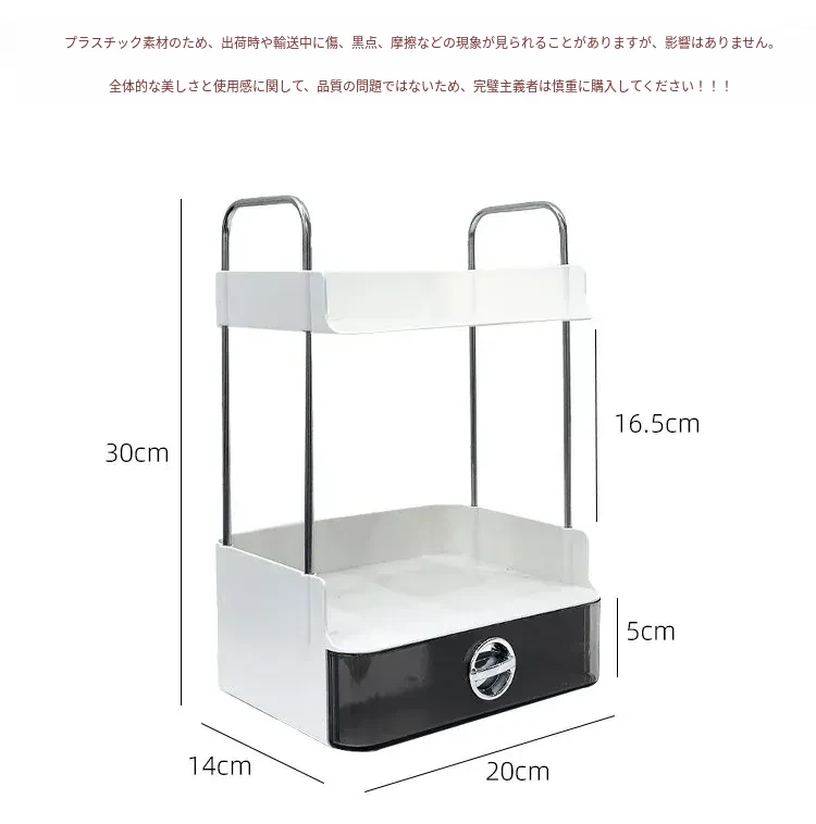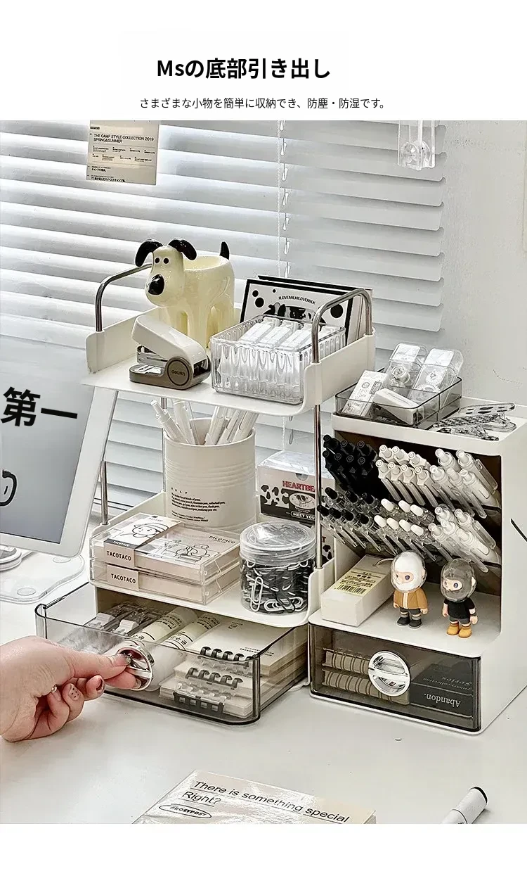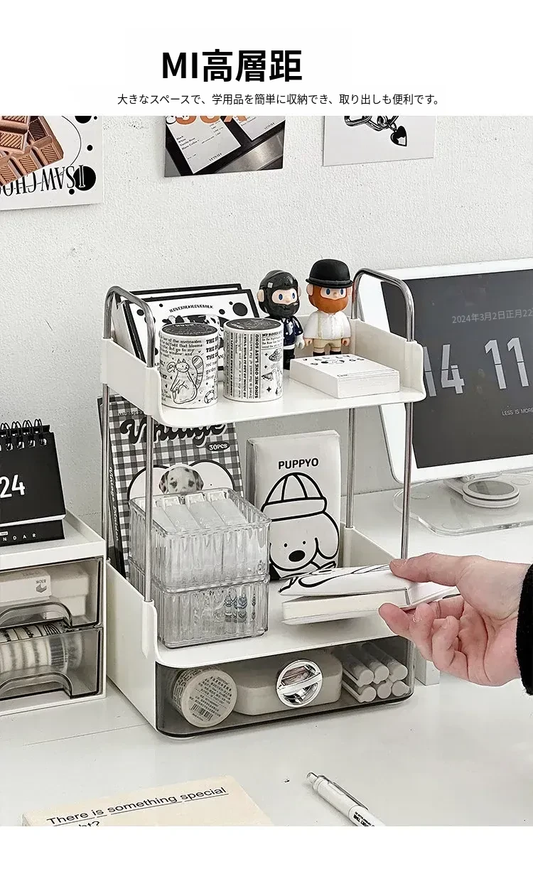 デスク収納ラック - 引き出し付き2段整理棚!文房具や小物をすっきり収納し、学習や仕事に最適なデスク環境を提供します。寮やオフィスでも使えるスタイリッシュなデザイン!