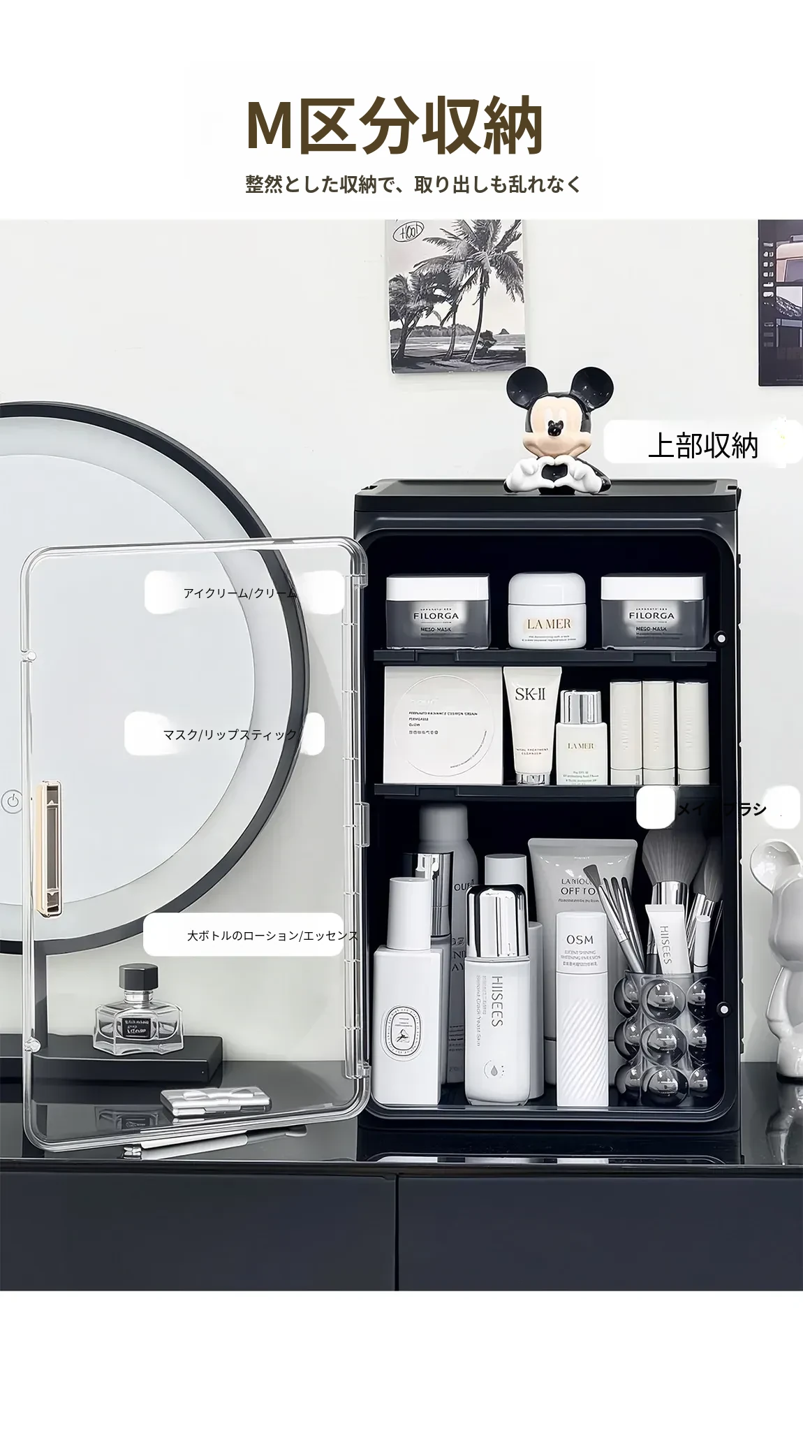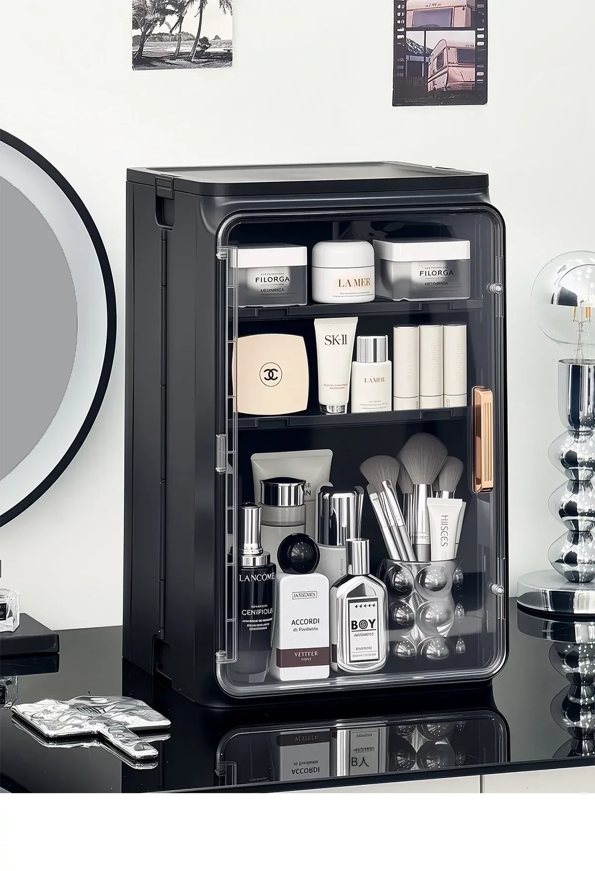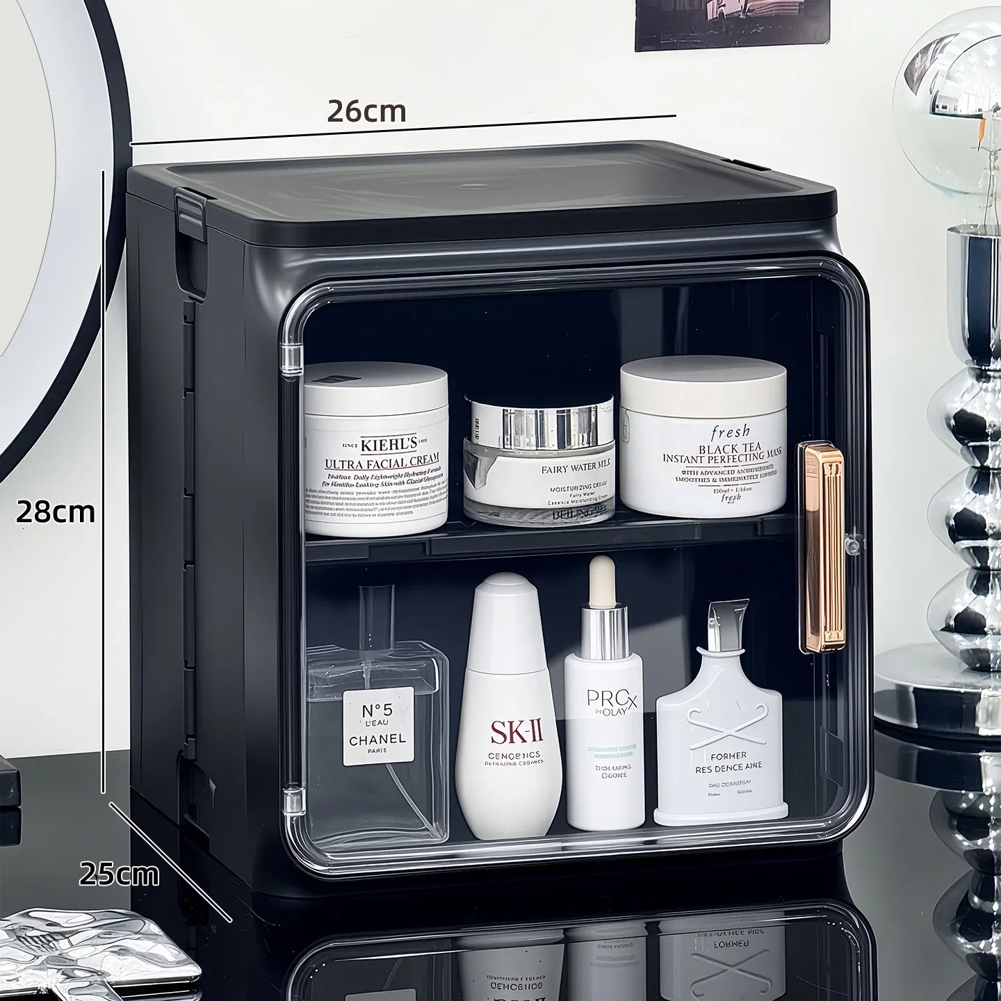 高級感溢れる化粧品収納ボックス - 大容量のスキンケアアイテムや香水をすっきり整理!メイク台を美しく演出するおしゃれな収納ラック。