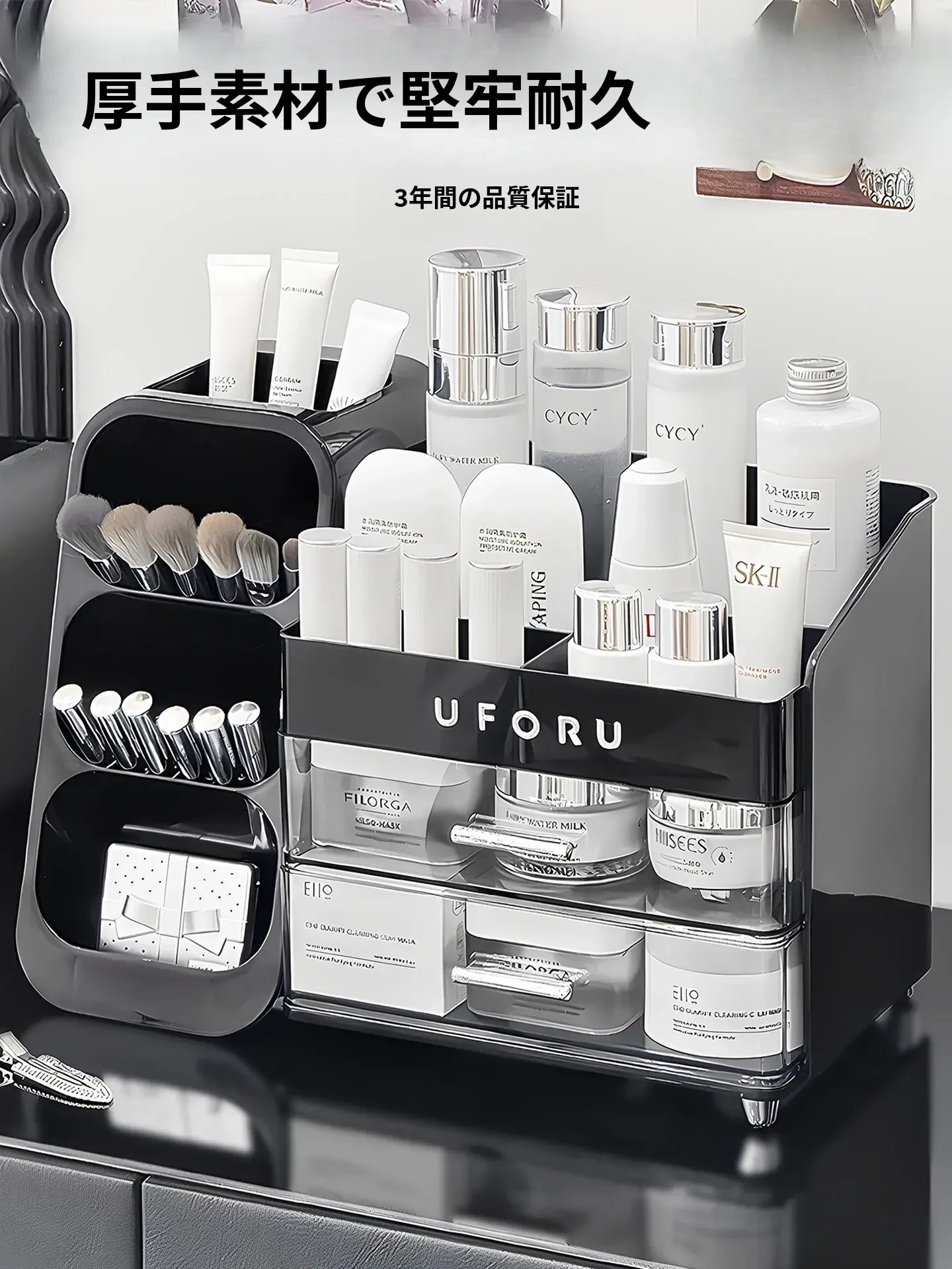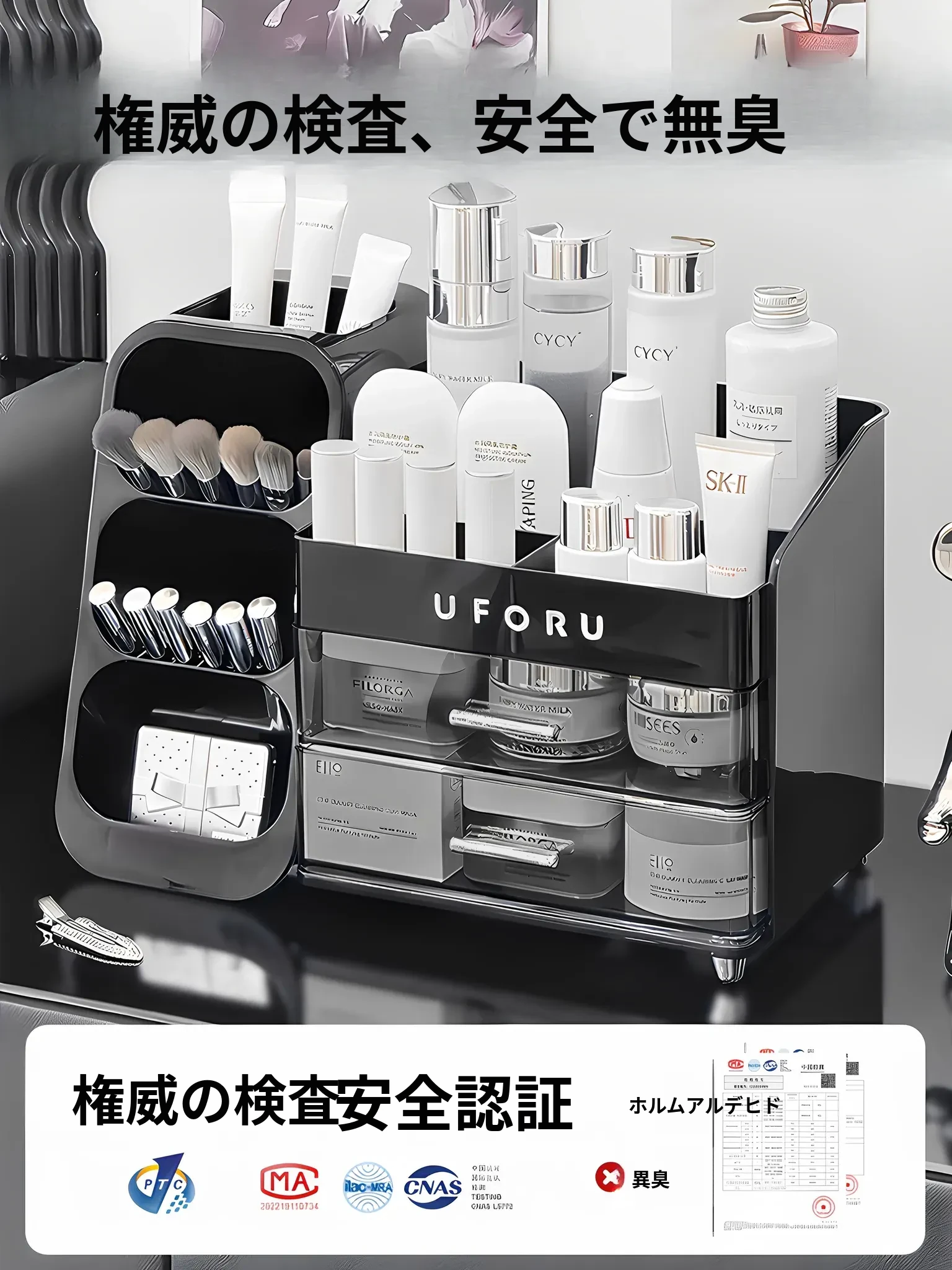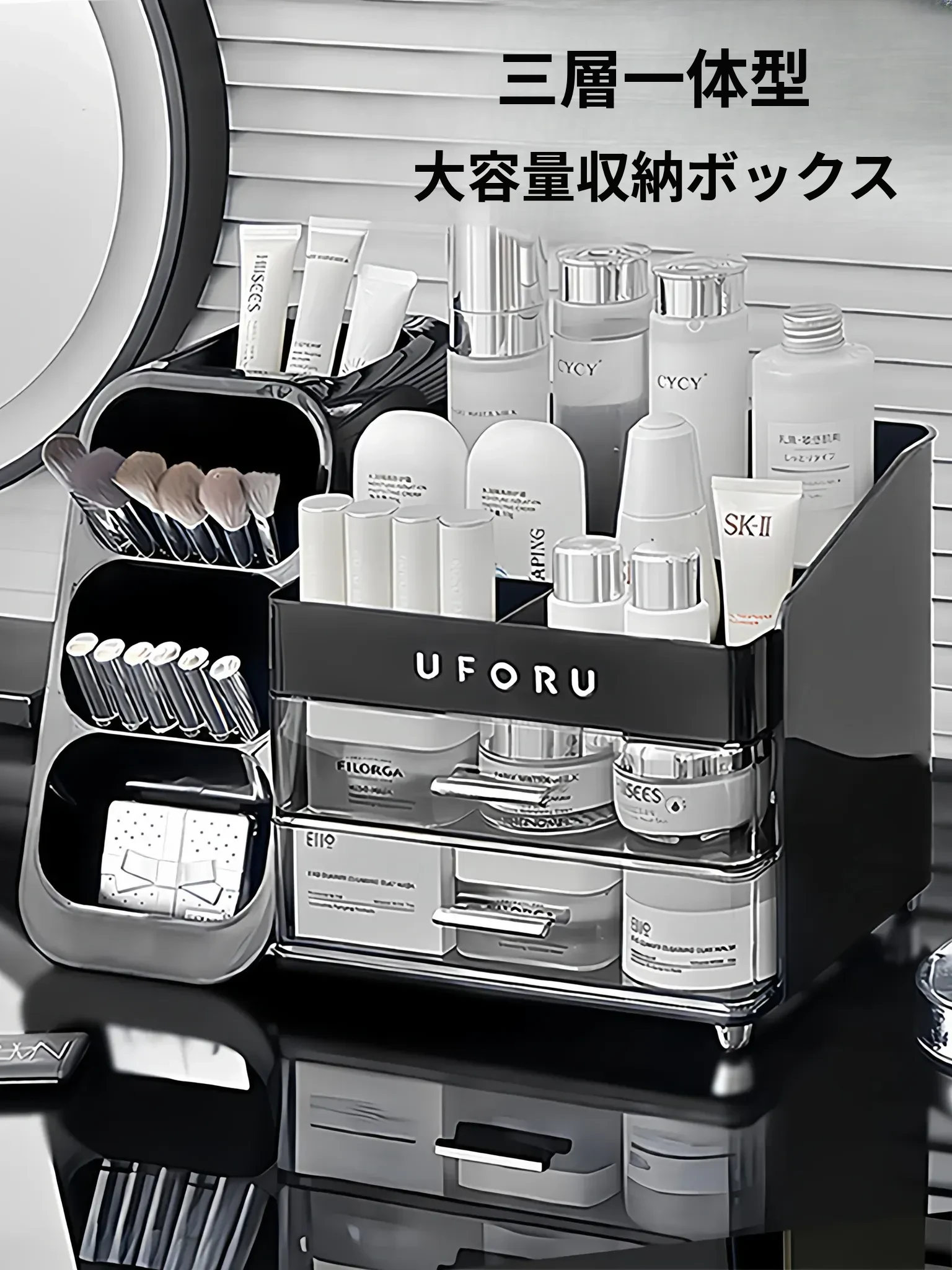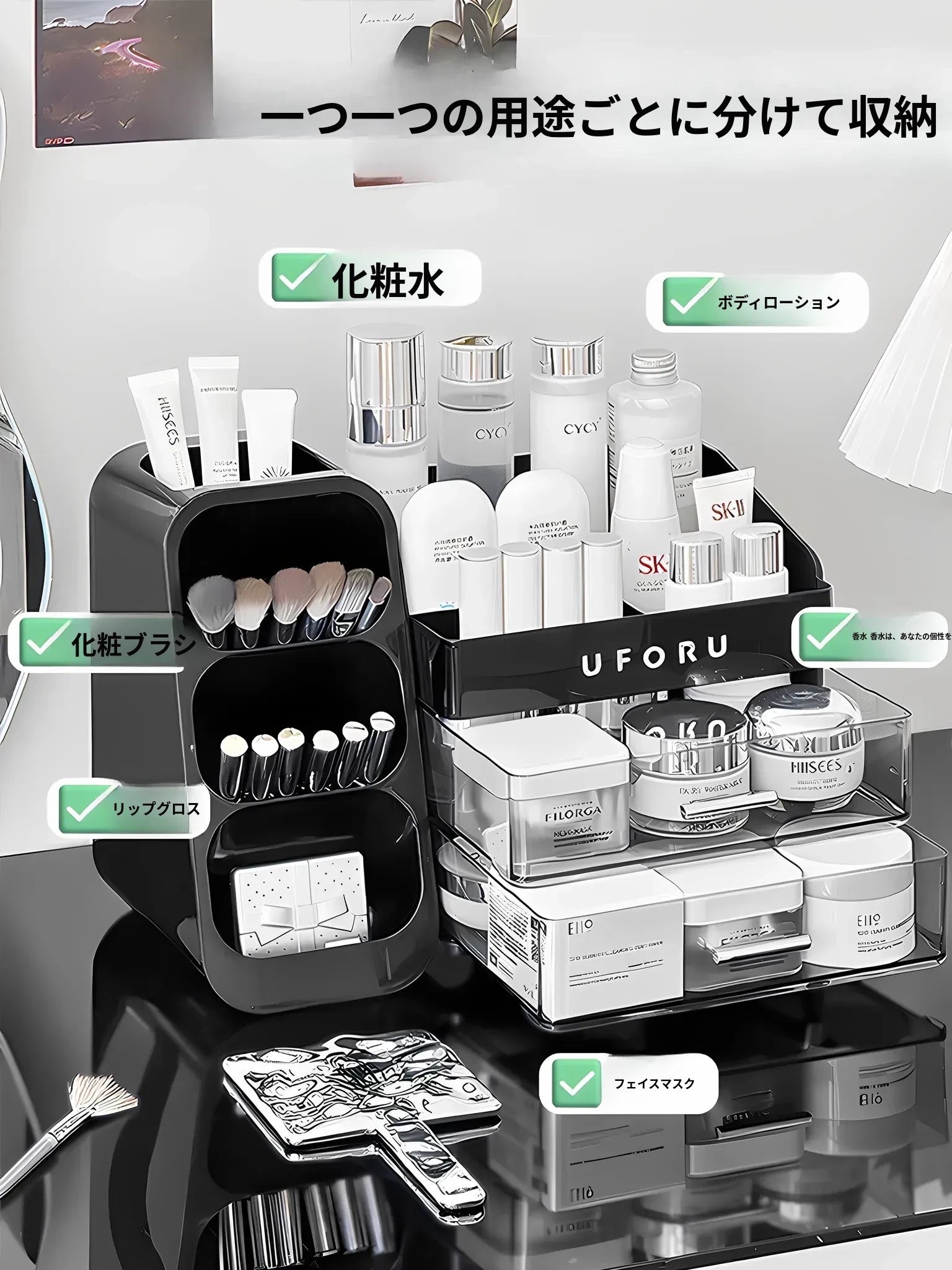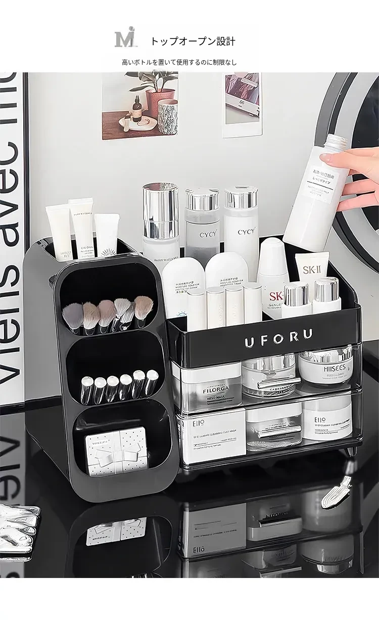 高級感溢れる化粧品収納ボックス|ドレッサー用スタイリッシュな整理ラック|スキンケアアイテムもすっきり整理|メイクブラシ収納筒で美しさを引き立てる!