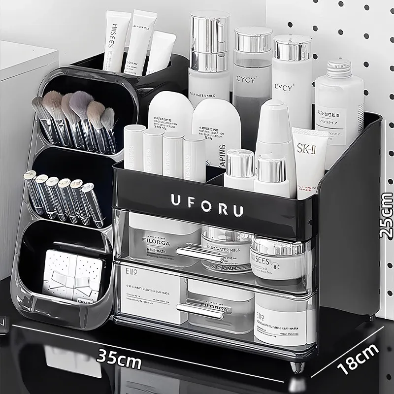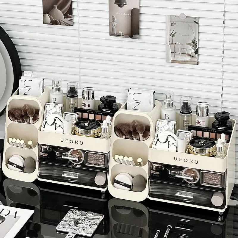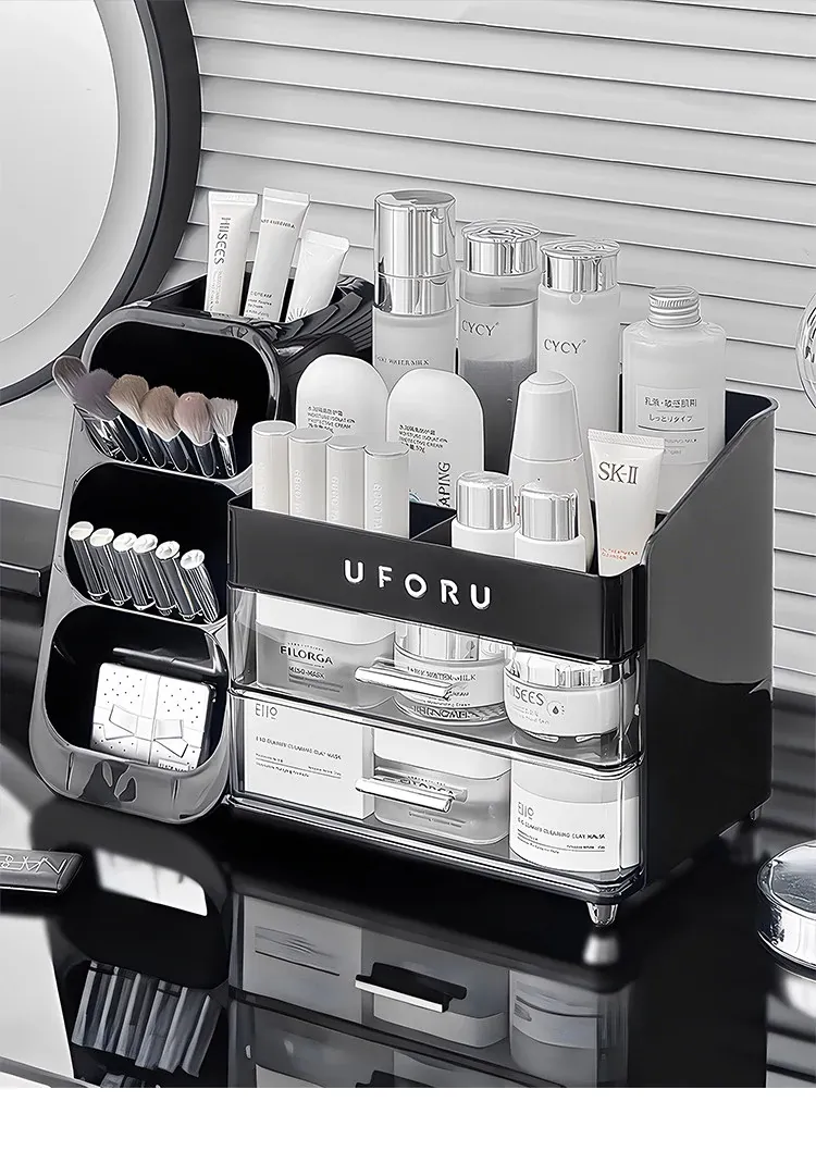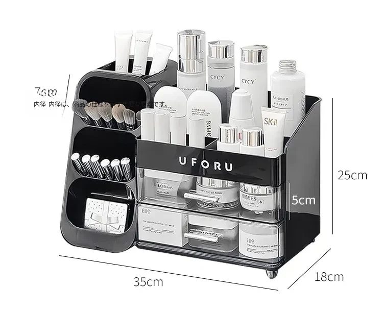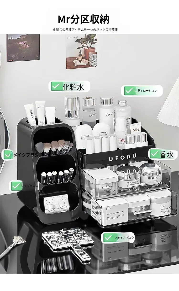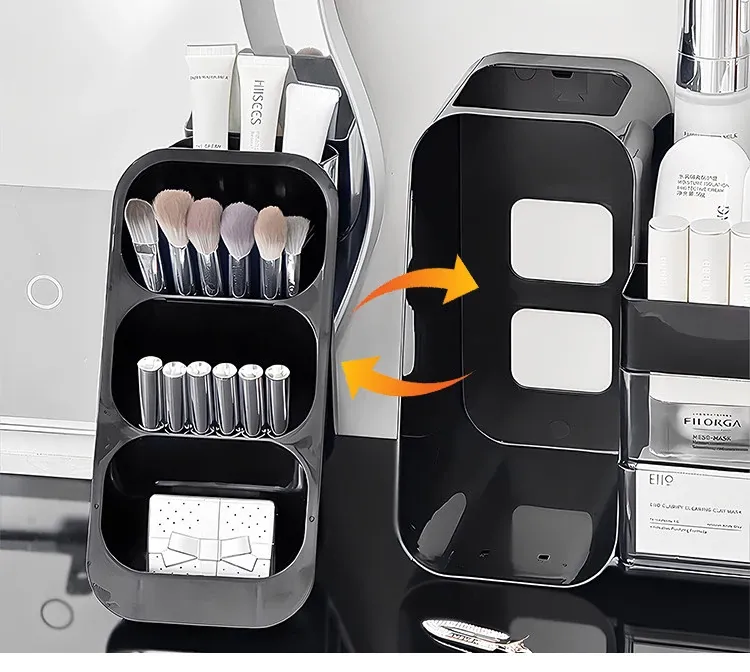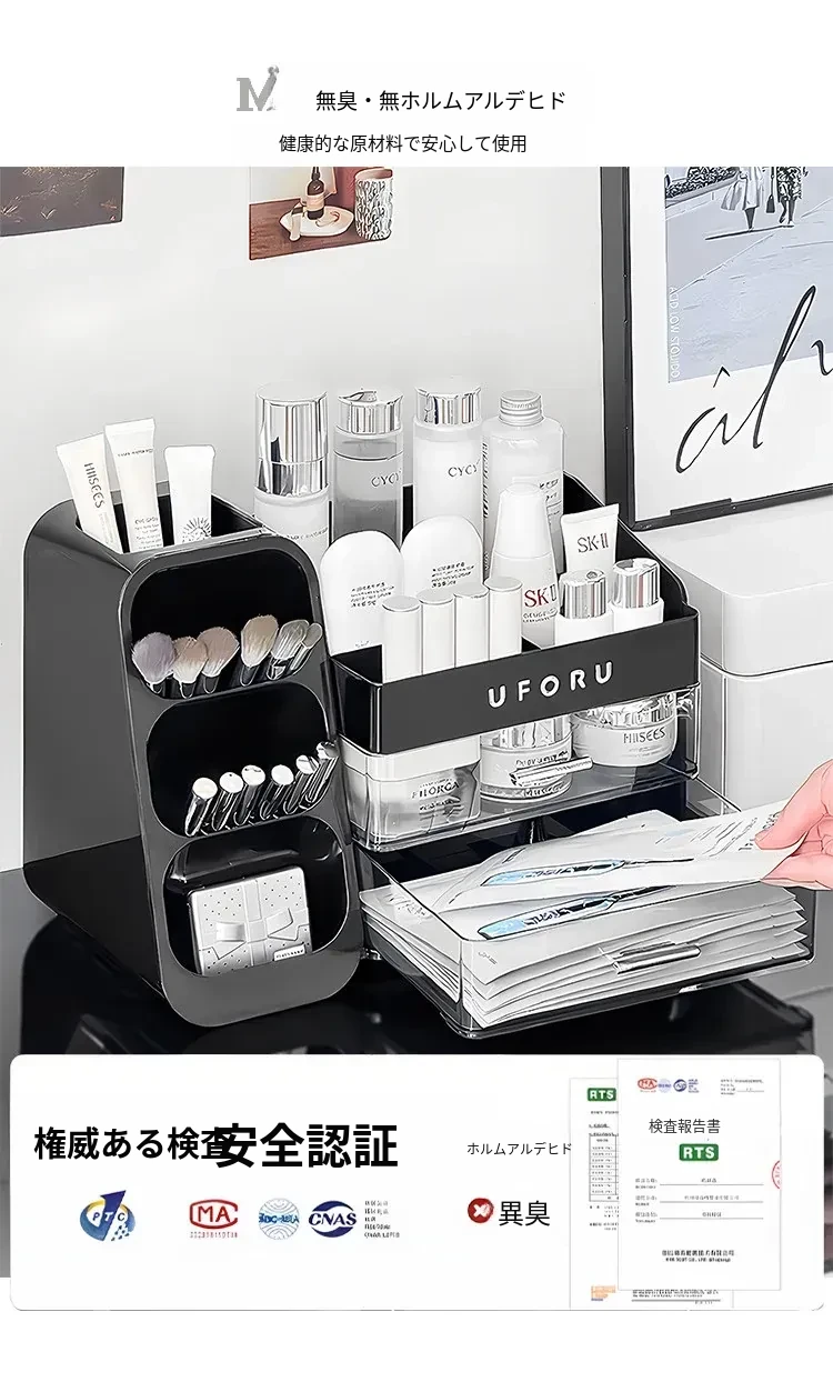 高級感溢れる化粧品収納ボックス|ドレッサー用スタイリッシュな整理ラック|スキンケアアイテムもすっきり整理|メイクブラシ収納筒で美しさを引き立てる!