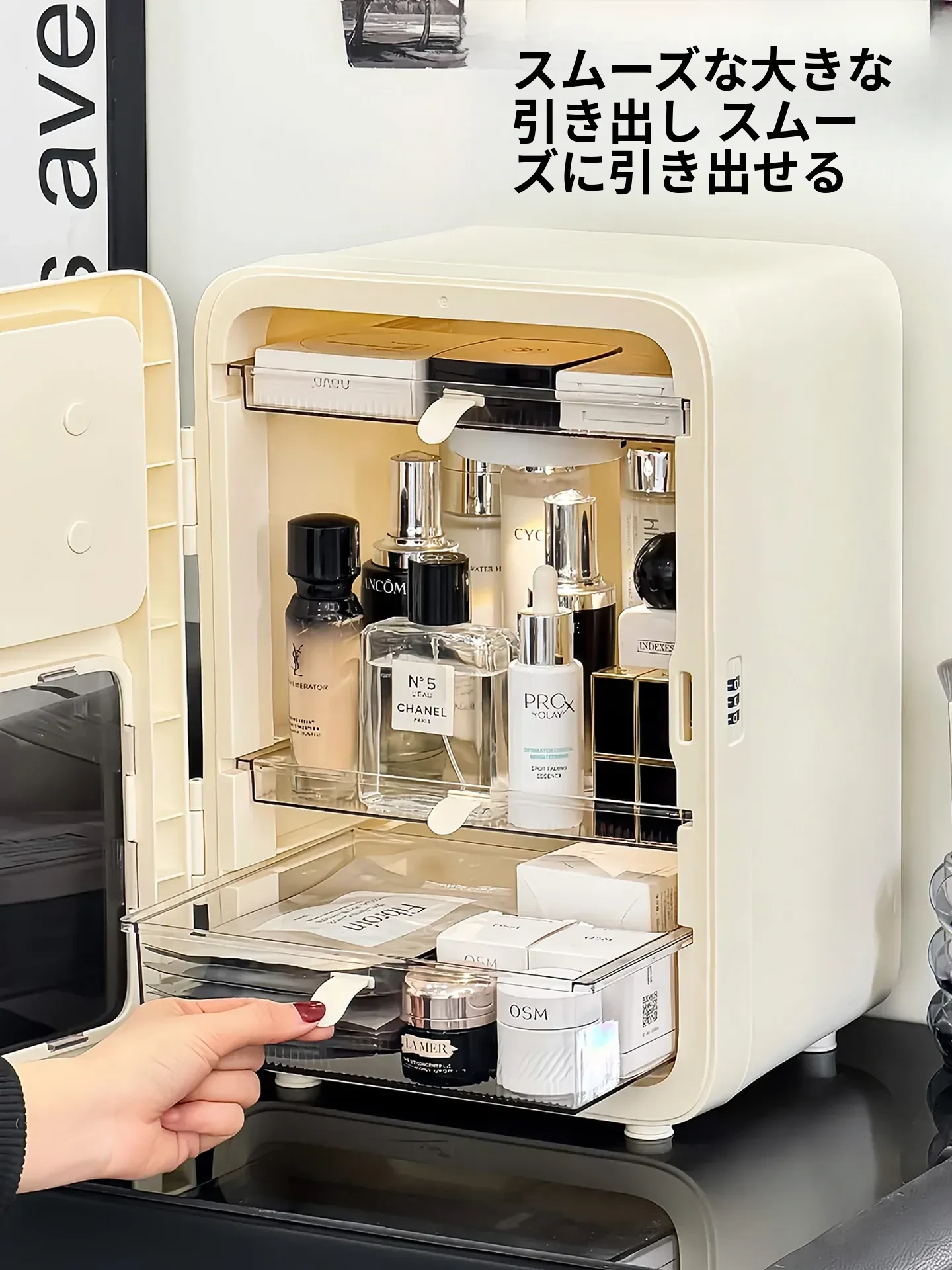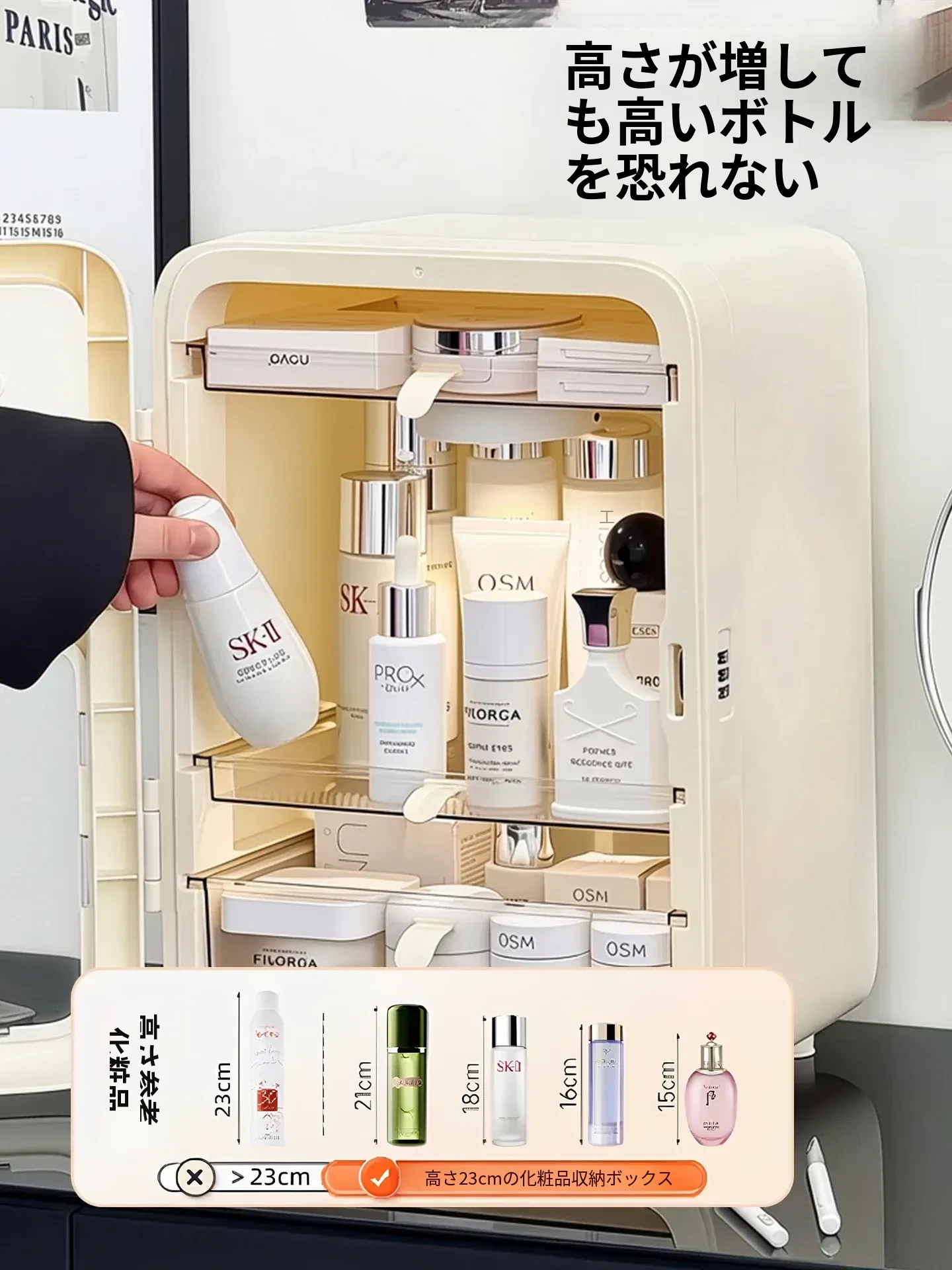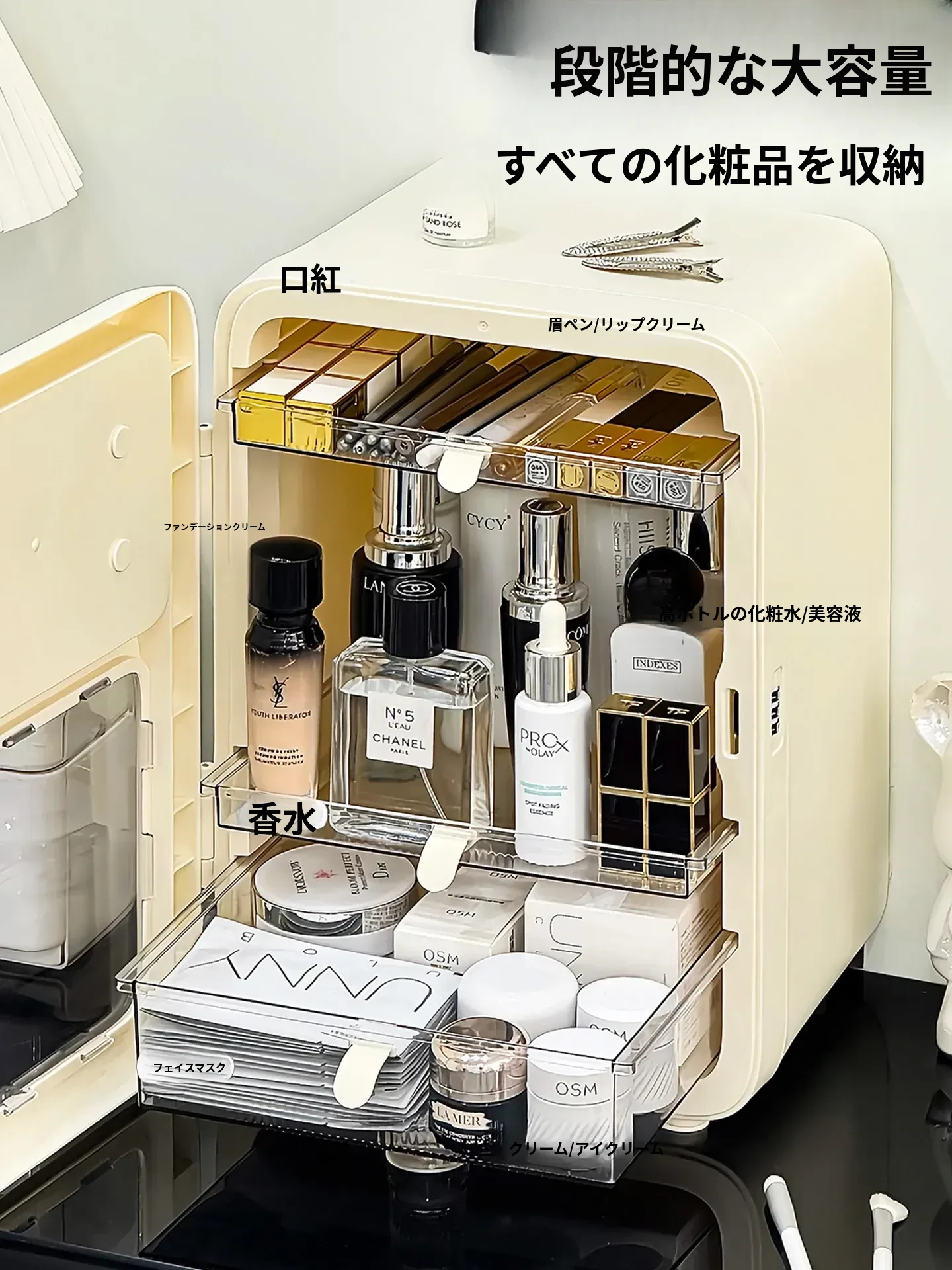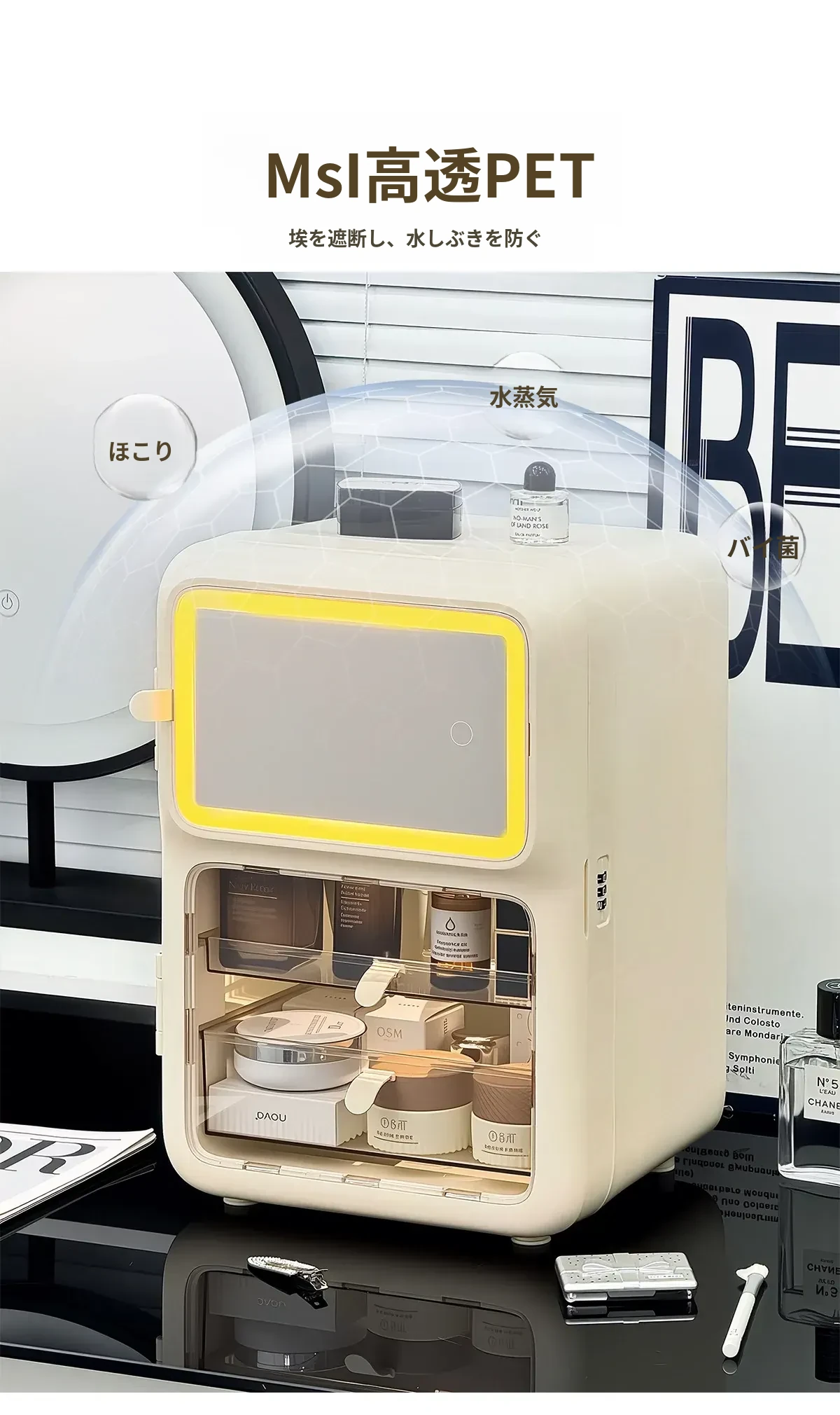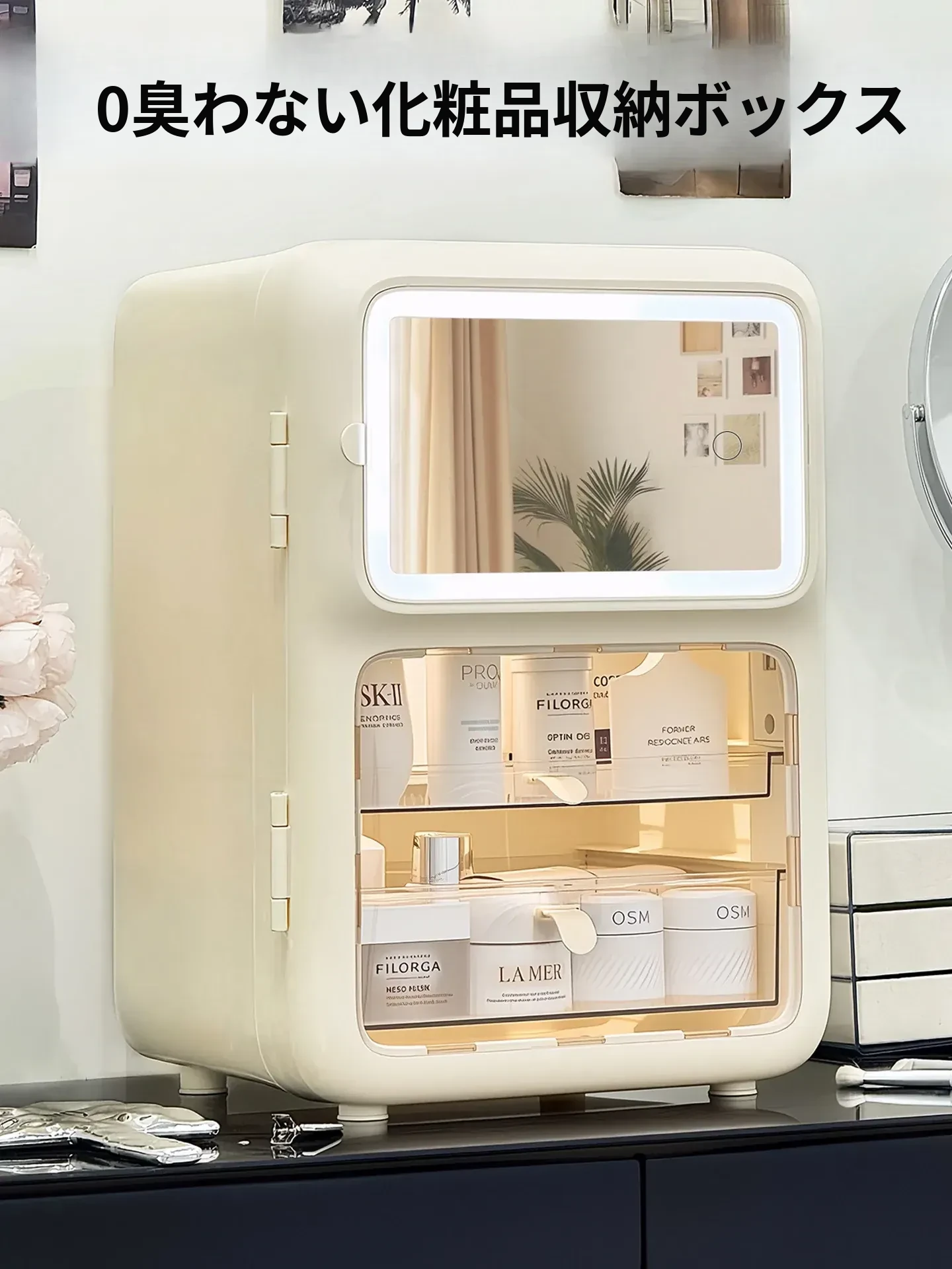 メイクアップ収納ボックス デスクトップ用 防塵 スキンケアアイテム整理ラック LEDミラー付き 新型 フェイスマスク&香水整理ボックス すっきりとした空間で美しさを保ちましょう!