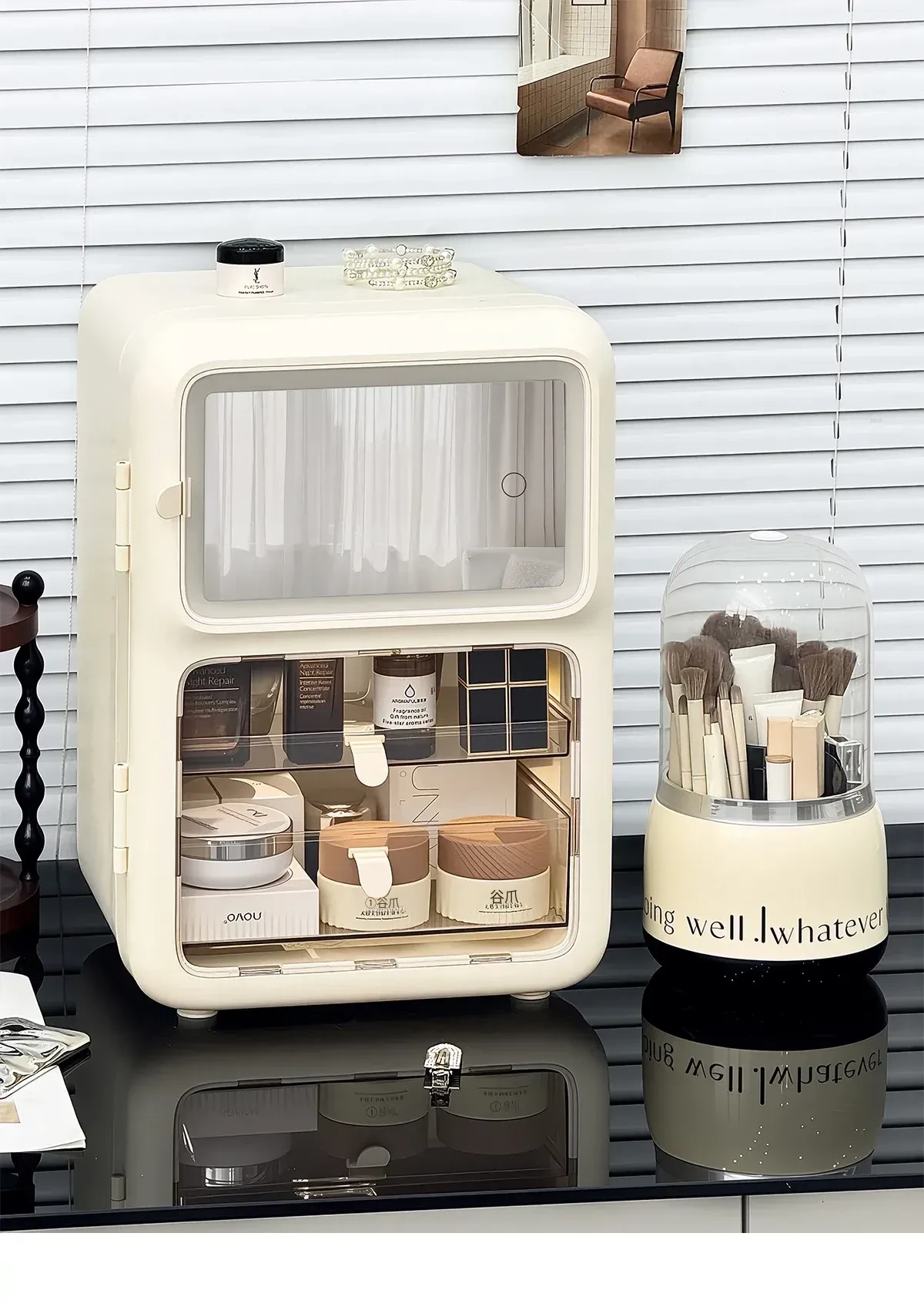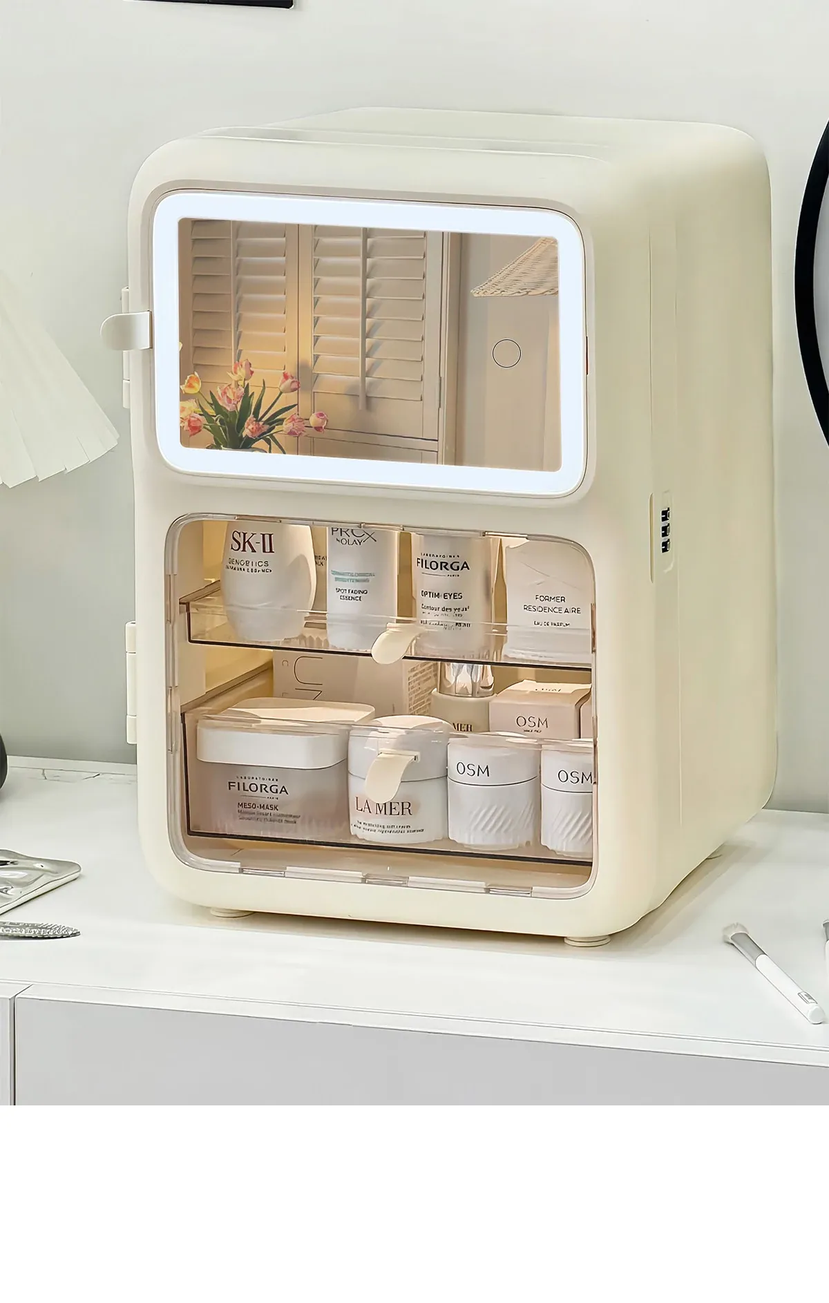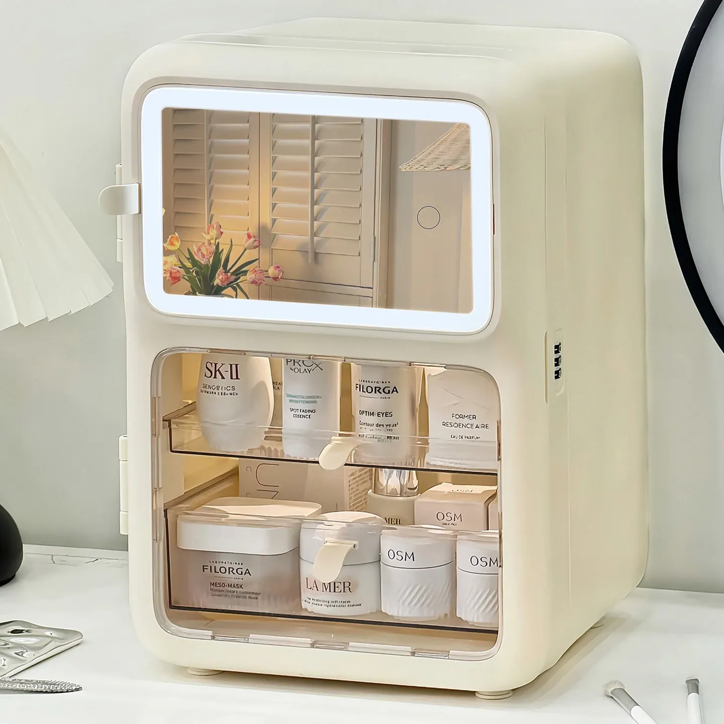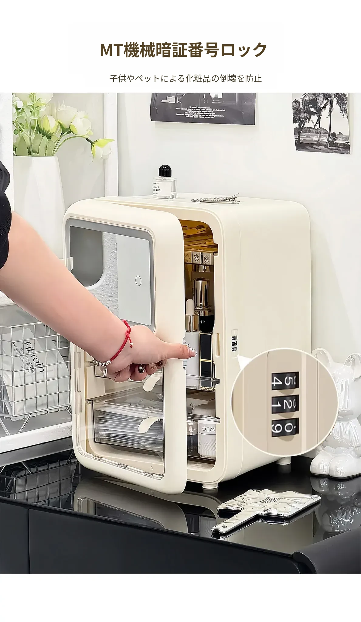 【鏡付きメイクボックス+ブラシホルダー】✅防塵大容量