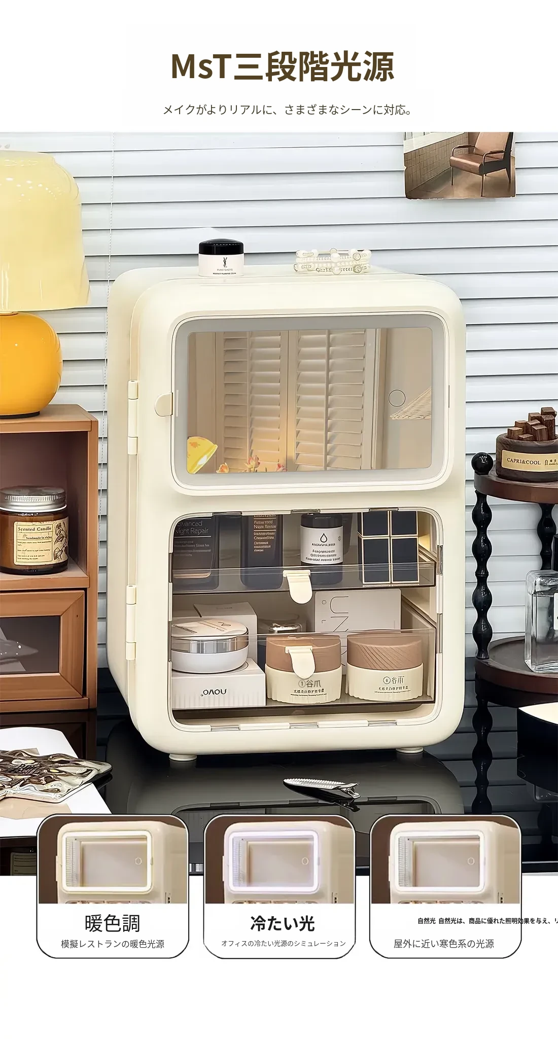 【鏡付きメイクボックス】3種類のライト✅防塵大容量