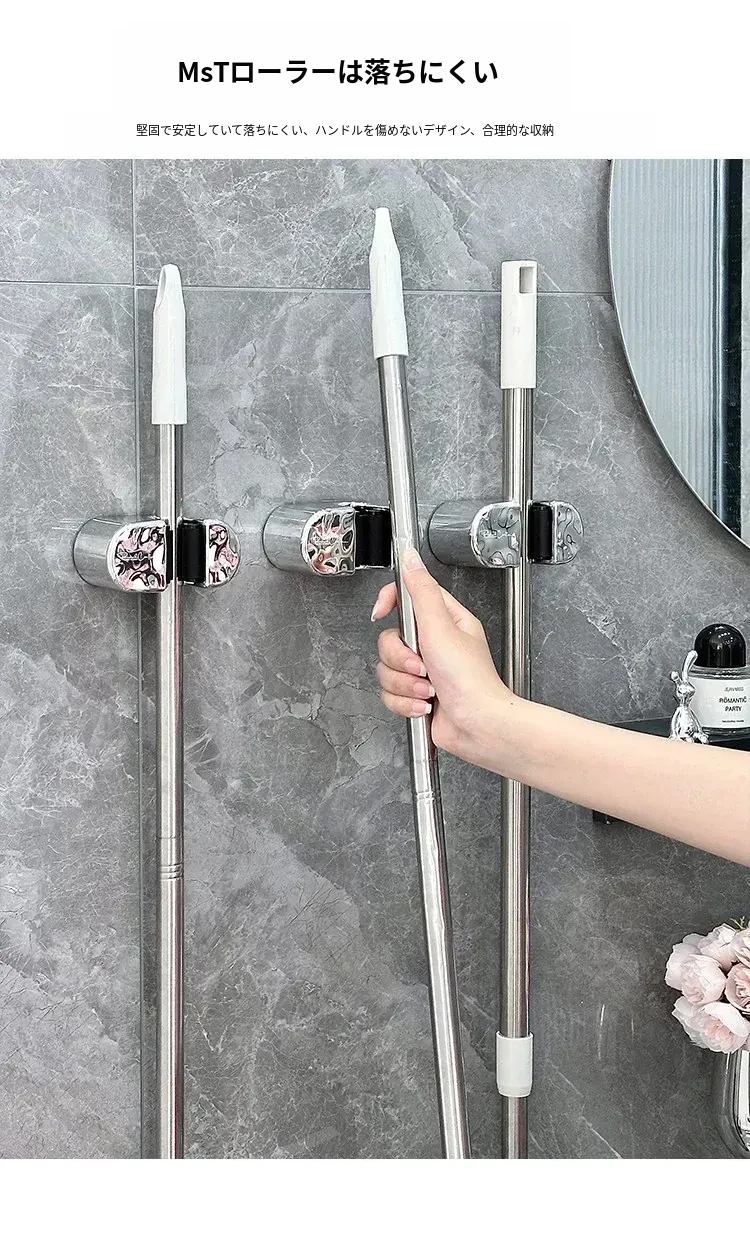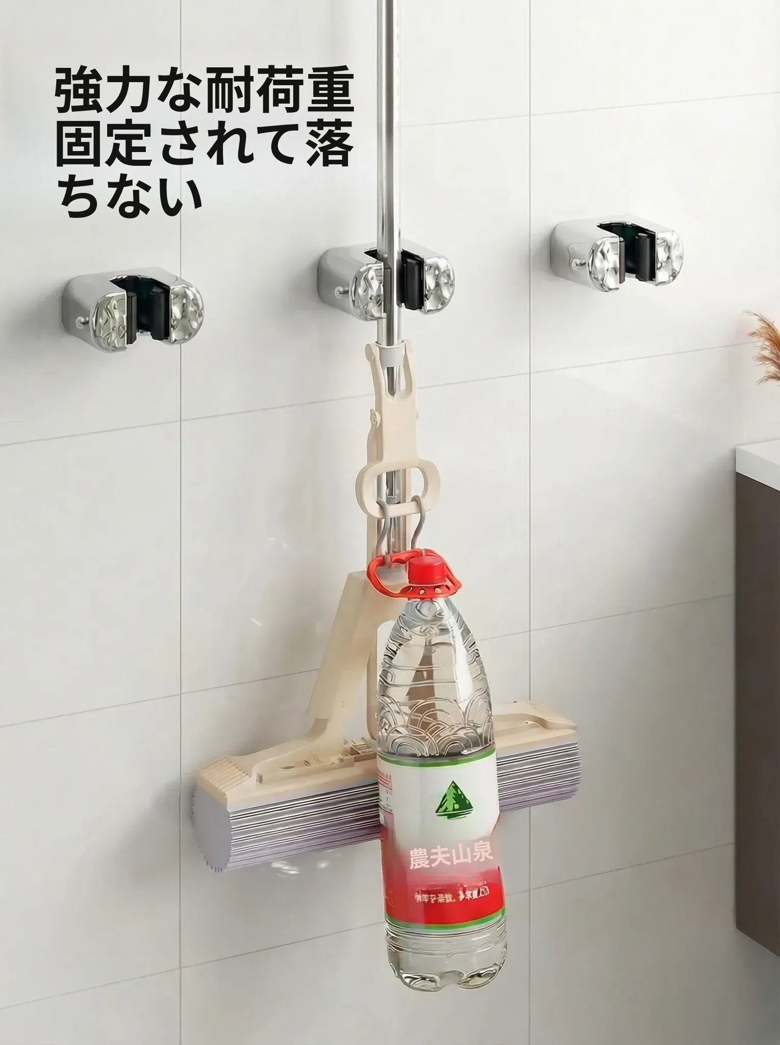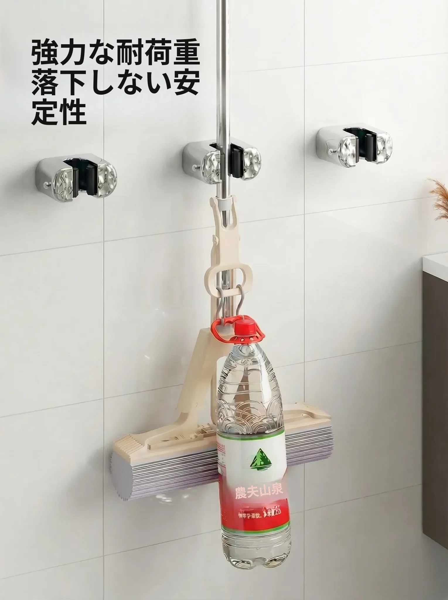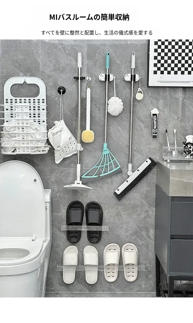 壁掛けモップクリップフック - 穴あけ不要で掃除道具をスマートに収納!トイレや洗面所の壁にぴったりの便利アイテムで、すっきりとした空間を実現します。