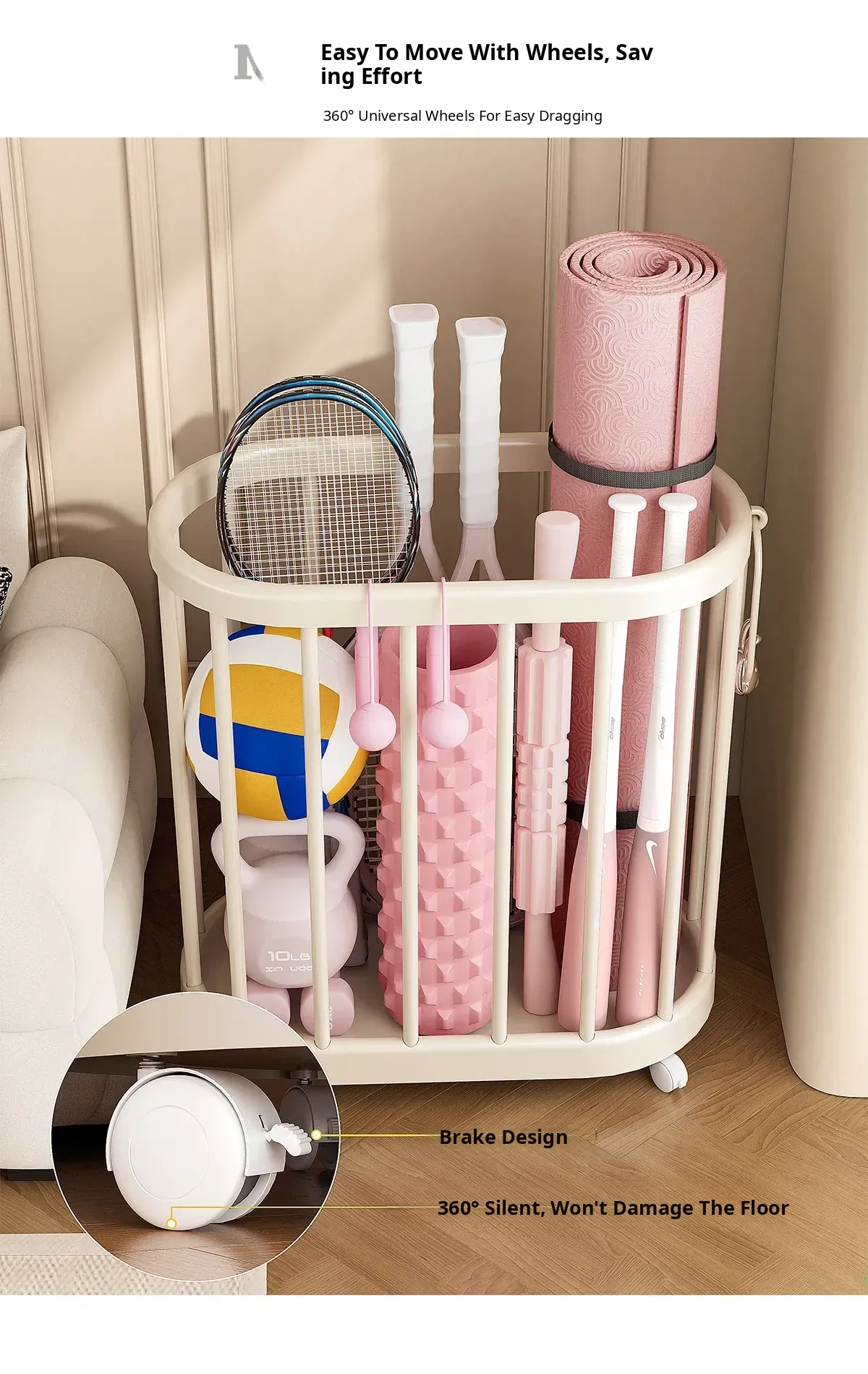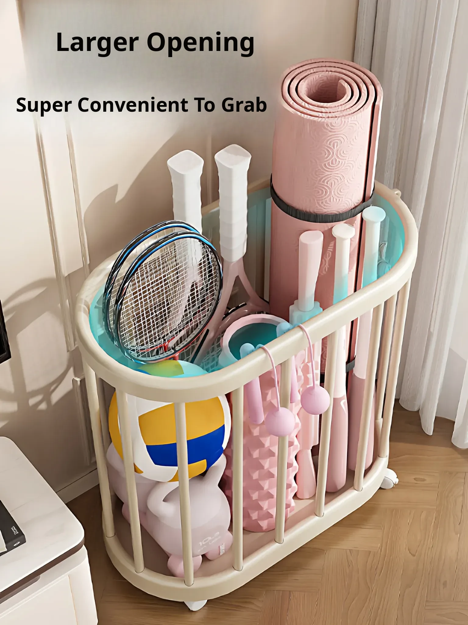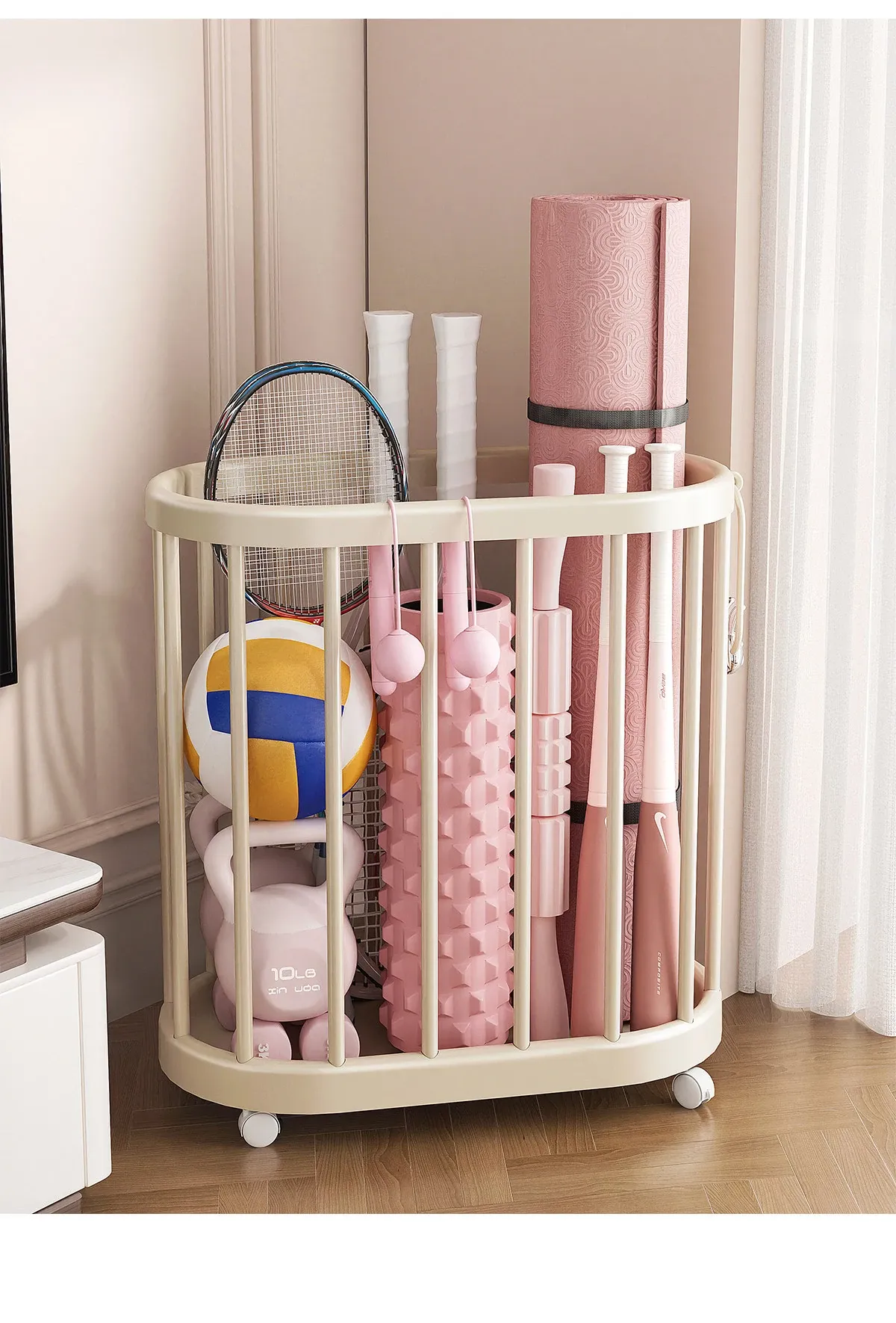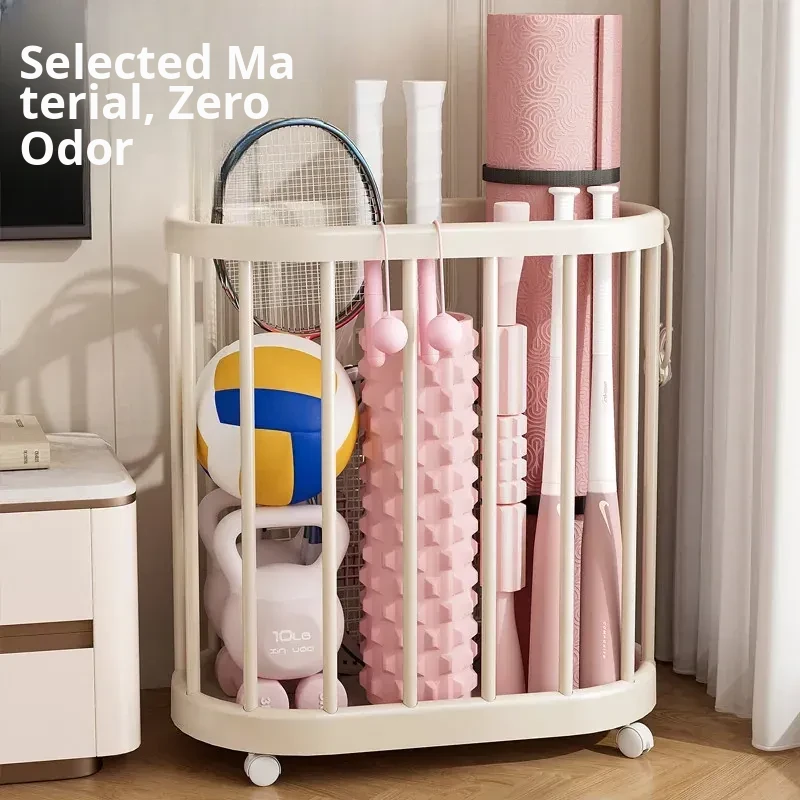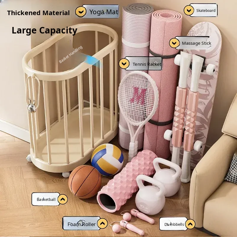 Yoga Mat Storage Basket - Home Fitness Equipment Organizer with Wheels for Dumbbells, Balls, and Rackets - Keep Your Workout Space Neat and Tidy!